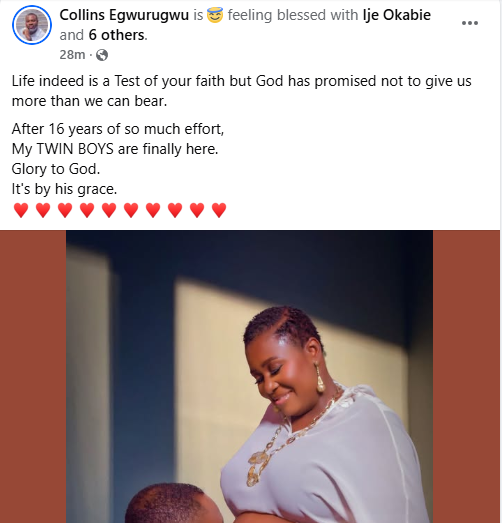 A Nigerian man, Collins Egwurugwu, has celebrated becoming a father after 16 years of marriage. He took to Facebook on Sunday, November 30, 2025 to announce that his wife gave birth to a set of twin boys. The children were born on Saturday, November 29. Recalling the years of waiting, pain, tears and questioning God, Collins admitted it wasn’t an easy decision to hold on to hope. He added that a lot came to his mind but he didn’t want to follow the footsteps of his father. “16 Years. Hmmmmmm. It wasn’t an easy Decision. To stay, to hold, not to give up. 16 years of Pain, doubts, tears, worries, anxiety, questions, etc,” he wrote. I felt like I did something wrong, I asked myself what did I do? Countless of child dedications I attended. I prayed for forgiveness of sins, pressures everywhere. A lot came to mind, I don’t want to walk in the path of my father. But God came through for me, na stick I drop, iron float. He showed me with mercy, he watered my seed and gave me increase, he denied the enemy their plans, God showed me GRACE! Today I am a proud father of two baby twin BOYS. Yesterday 29th November 2025 she put to birth two lovely boys. I came back to give him glory. I came back to thank him for mercies My name na PAPA TWINS, Wow. Congratulations to me. Congratulations to my dear wife Queen Collins the mother of my lovely TWINS. Children Dedication loading..