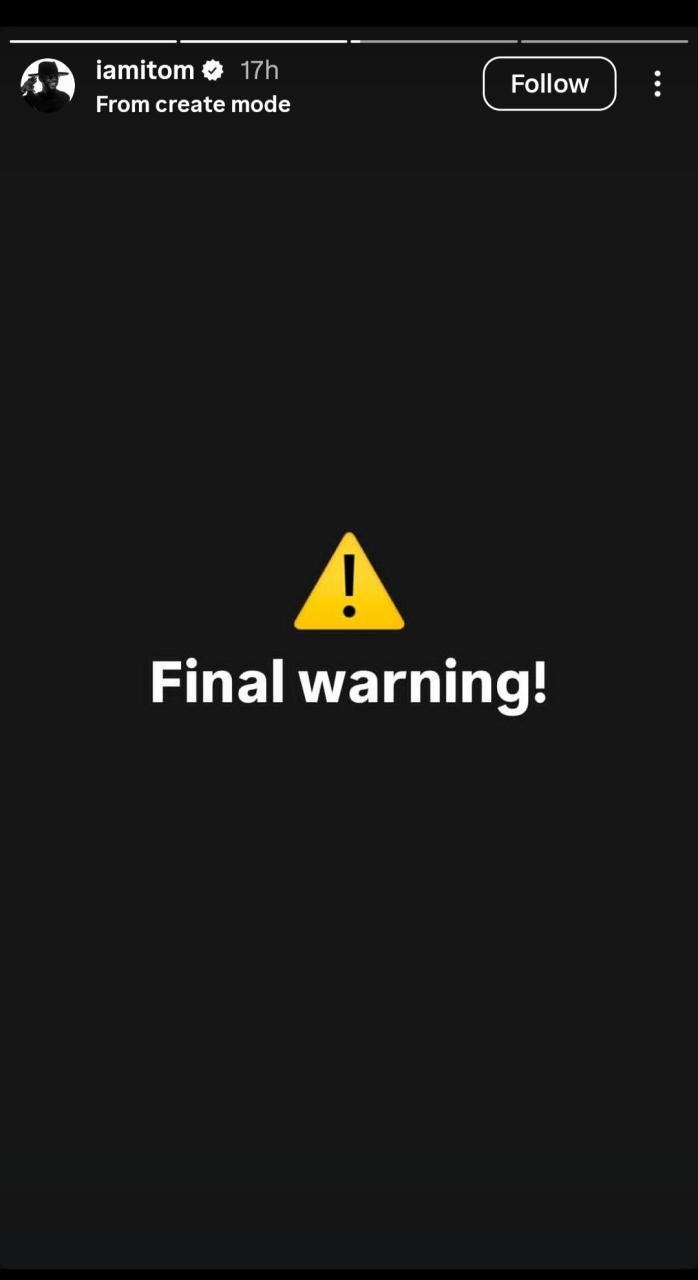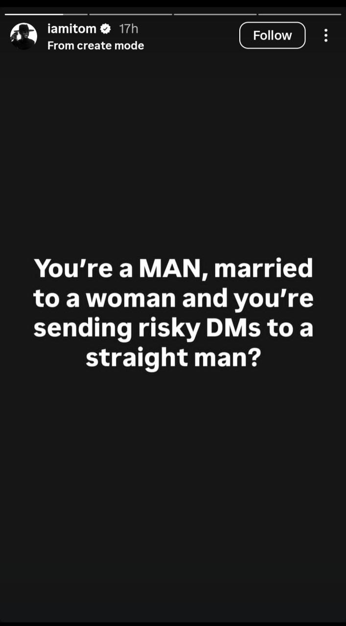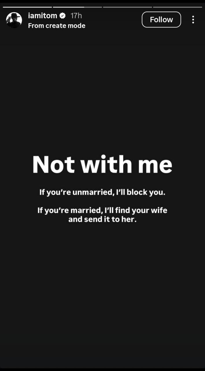 Frank Itom has warned married men to stop sending messages to his DM. The content creator who married DANG founder, Ifedayo Agoro, this year, took to his Instagram stories to issue the “final warning”. He pointed out that married and single men send him “risky” messages but he was more upset about the men with wives who were hitting on him. He added that henceforth, he would block the single men hitting on him inbox and would report the married men to their wives. See below.