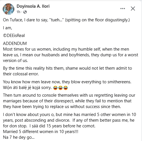 A 60-year-old Nigerian woman, Doyinsola A IIori, has revealed that her ex-husband has married five women in ten years since he absconded and later divorced her.  The mother of four disclosed this in a Facebook post on Tuesday, December 2, while reacting to singer and his wife Natasha’s altercation.  Doyinsola had earlier recalled the time she decided to leave her marriage due to constant disputes and infidelity but had to jettison the plans and instead stayed in a loveless relationship for the sake of her children.  However, when her husband decided to leave their marriage, he did so without considering how the decision would affect their family.   According to her, she told him to consider how the divorce would affect their children. He simply told their children that his joy is more important than them and walked away.  On Tuface, I dare to say, tueh… Most times for us women, including my humble self, when the men leave us, I mean our husbands and boyfriends, they dump us for the worst version of us, she wrote. “By the time this reality hits them, shame would not let them admit to their colossal error. You know how men leave now, they blow everything to smithereens. Wn ti bal j kj sorry Then they turn around to console themselves with us regretting leaving our marriages because of their disrespect, while they fail to mention that they have been trying to replace us without success since then. I don’t know about yours o, but mine has married 5 other women in 10 years, post absconding and divorce. If any of them better pass me, he for don stop. I did 15 years before he comot. Married 5 different women in 10 years!!! Na 7 he dey go. (Kay, Oya k bet with me.) The 7 sef, na him children I pity, otherwise, he for change wife till he kpai at any age ni. PS: Tuface dey kraze, he no well. Na laff Annie suppose dey laff him family now. Sebi na she, dem say she no good, and dem no like. Make dem dey manage Natasha now n. Na so I laff my ex husbands family, when only two years after he married that d3ad lady, they started chanting, gb Iya Bb gan o le t’eyii.    The post Most times our husbands dump us for the worst version of us – 60-year-old Nigerian woman reveals her ex-husband has married 5 women in 10 years post divorce appeared first on Linda Ikeji Blog.