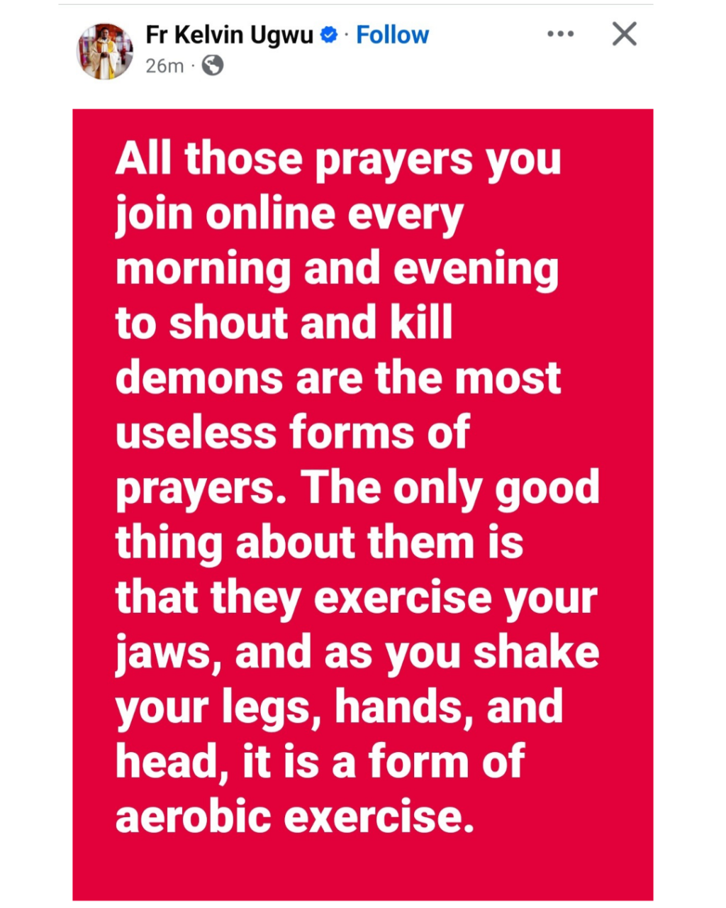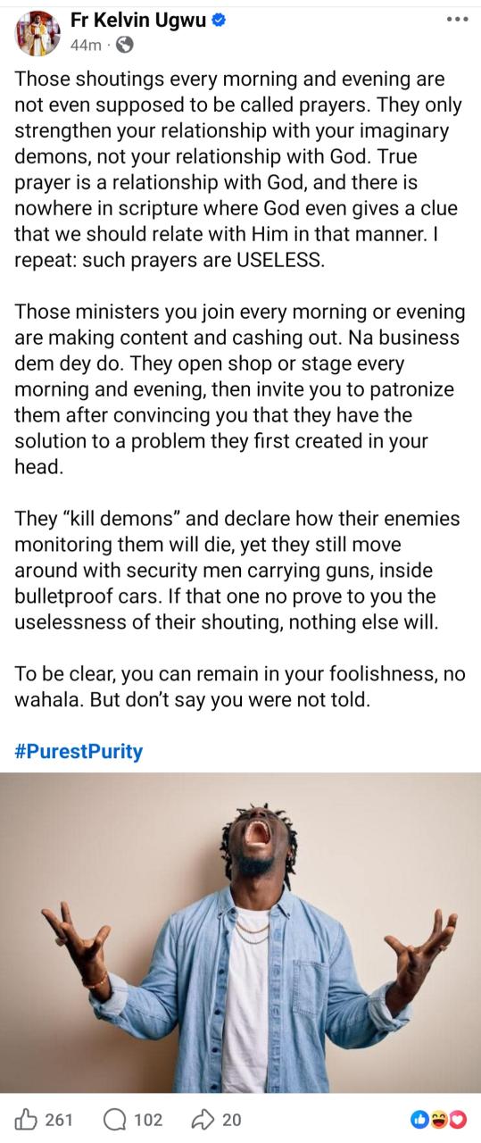 A Catholic Priest has targeted those who join prayers online daily. Rev. Fr. Kelvin Ugwu took to Facebook to claim that online prayers iare the most “useless” kind of prayers and they achieve nothing. He wrote: “All those prayers you join online every morning and evening to shout and kill demons are the most useless forms of prayers. The only good thing about them is that they exercise your jaws, and as you shake your legs, hands, and head, it is a form of aerobic exercise.”