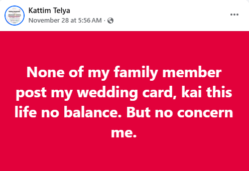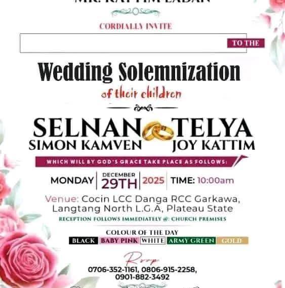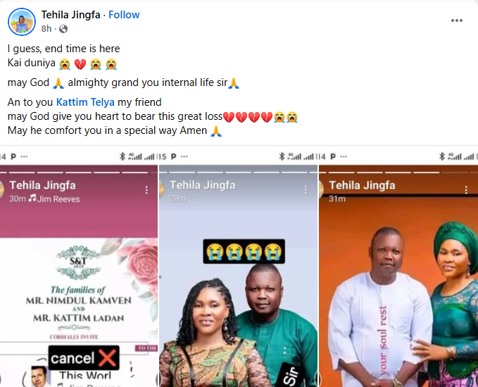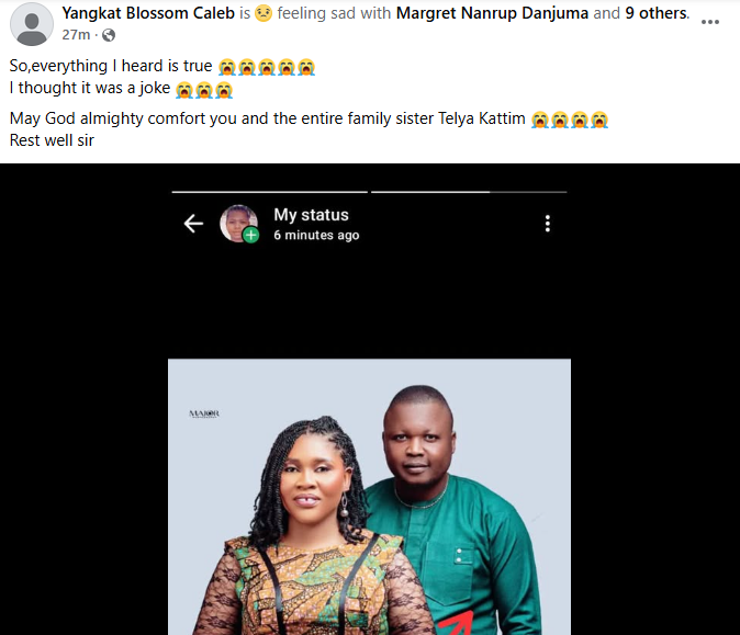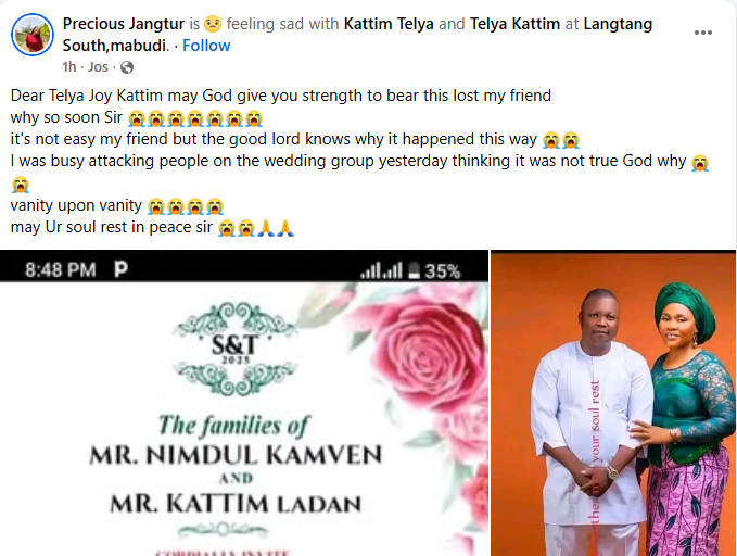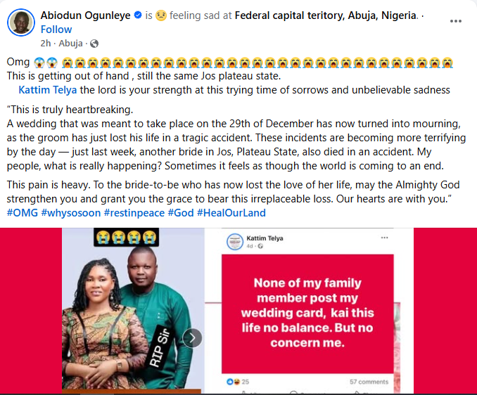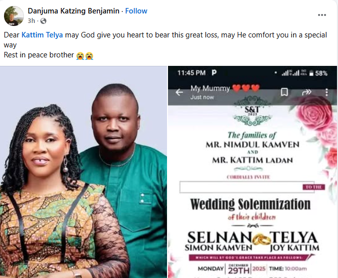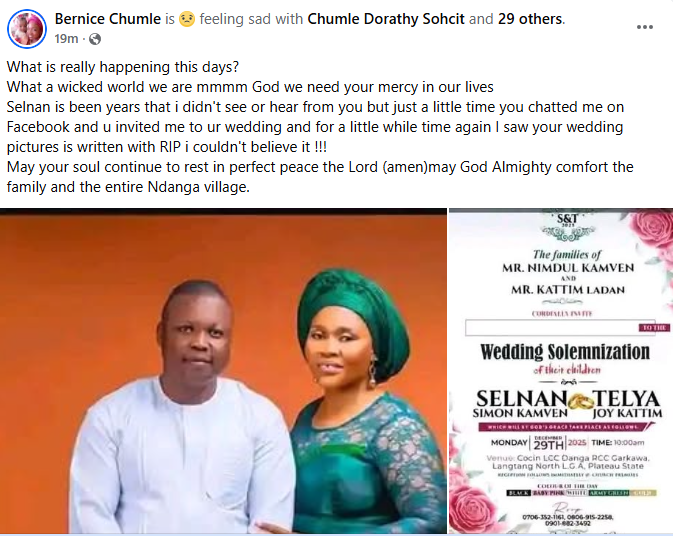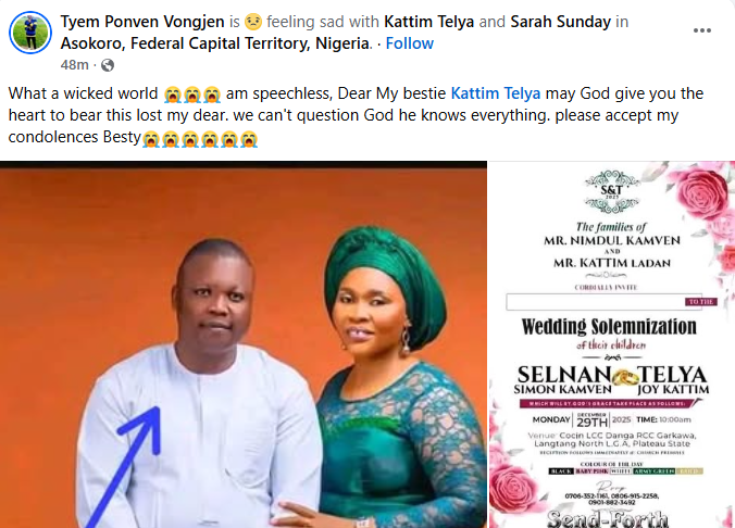 A Nigerian woman, Kattim Telya has been thrown into mourning after her fianc Selnan Simon Kamven d!ed in a motor accident four weeks to their wedding. The couple’s wedding was scheduled to hold on December 29, 2025 in Langtang North Local Government Area of Plateau State. So it’s true. Daddy, I am still waiting for your call, Kattim wrote in a Facebook post on Wednesday, December 3. Meanwhile, friends, family members and acquaintances have taken to Facebook to mourn the deceased and condole with his grieving fiance, Kattim. Bernice Chumle wrote: What is really happening these days? What a wicked world we are mmmm. God we need your mercy in our lives. Selnan it has been years that I didn’t see or hear from you but just a little time you chatted me on Facebook and u invited me to ur wedding and for a little while time again I saw your wedding pictures are written with RIP I couldn’t believe it !!! May your soul continue to rest in perfect peace the Lord (amen)may God Almighty comfort the family and the entire Ndanga village. Tyem Ponven wrote: What a wicked world. Speechless, Dear My bestie Kattim Telya may God give you the heart to bear this lost my dear. we can’t question God he knows everything. Please accept my condolences, Besty. Danjuma Benjamin wrote: Dear Kattim Telya, may God give you heart to bear this great loss, may He comfort you in a special way. Rest in peace brother.