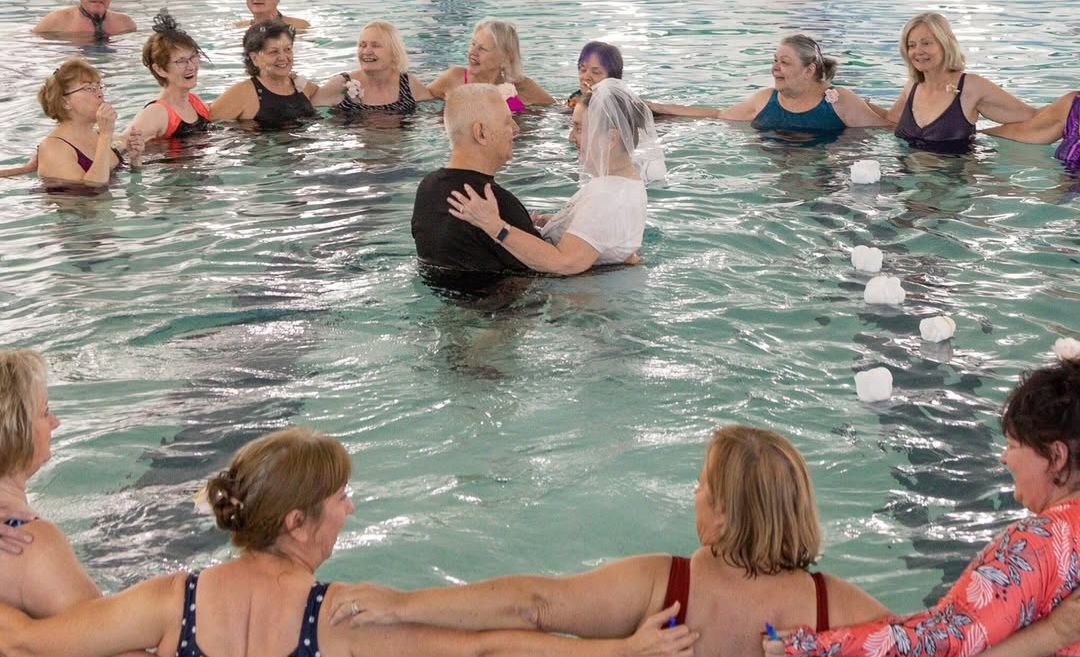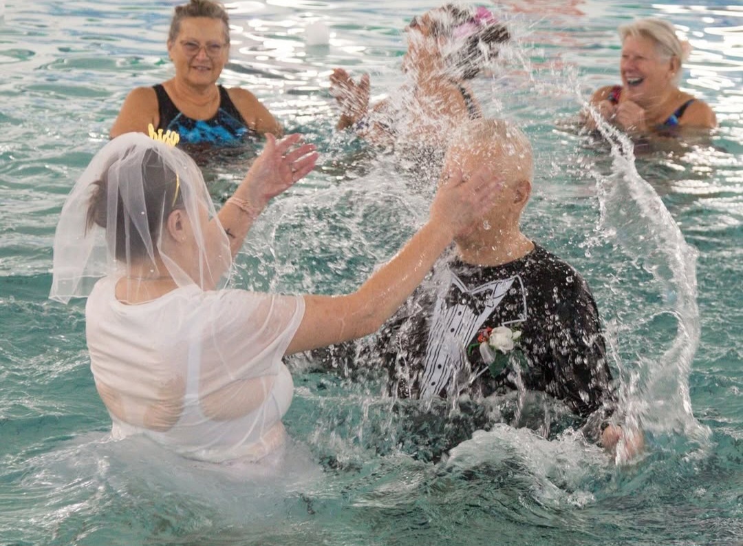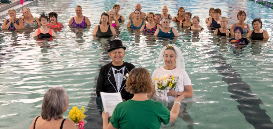 A couple got married inside a pool filled with lukewarm water to honour how their love began. Marlene Parsons, 78, and Edward La Rue Sr., 83, met three years earlier in the same pool during water aerobics classes when they playfully splashed each other. Both their spouses had recently d!ed, and neither one had an interest in remarrying a condition they agreed upon when they started dating. However, things changed and they got married in Nov. 2025, in the shallow end of an Illinois pool, where their scheduled water aerobics class was cancelled just for the wedding ceremony to hold. The bride walked out of the locker room and onto the pool deck wearing a tutu over her swim trunks and white water shoes. The groom also wore swim trunks, though his were black. The couple held hands to descend the stairs into lukewarm water.