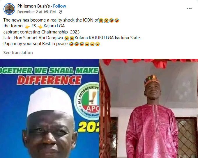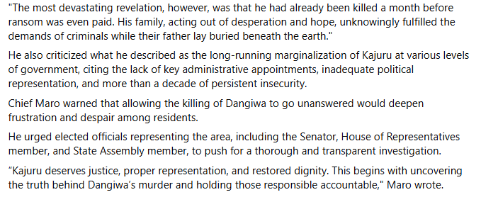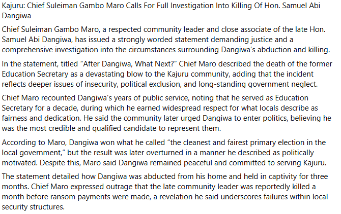 Bandits k!lled abducted retired teacher and former Education Secretary of Kajuru Local Government in Kaduna State, Samuel Abi Dangiwa and went ahead to collect ransom from his family a month after his d3ath. LIB reported that Dangiwa was abducted along with six others from Kufana village on the Kaduna-Kachia Road on Monday, 15 September 2025. The tragic development was confirmed by a community leader and associate of the deceased, Chief Suleiman Gambo Maro, who disclosed that Dangiwa had been k!lled a month before his family fulfilled the ransom demands. In a statement, titled: After Dangiwa, What Next? Chief Maro described the abduction and k!lling of the deceased as a devastating blow to the Kajuru community, adding that the incident reflects deeper issues of insecurity, political exclusion, and long-standing government neglect” “The most devastating revelation, however, was that he had already been k!lled a month before ransom was even paid, Maro said. “His family, acting out of desperation and hope, unknowingly fulfilled the demands of criminals while their father lay buried beneath the earth. He recounted Dangiwa’s years of public service, noting that he served as Education Secretary for a decade, during which he earned widespread respect for what locals describe as fairness and dedication. Chief Maro said the community urged Dangiwa to enter politics, believing he was the most credible and qualified candidate to represent them. Chief Maro called for urgent action and accountability, emphasising that the unresolved m8rder had heightened despair in the community. “Allowing the k!lling of Dangiwa to go unanswered would deepen frustration and despair among residents, he stated. Kajuru deserves justice, proper representation, and restored dignity. This begins with uncovering the truth behind Dangiwas m8rder and holding those responsible accountable,” he concluded.