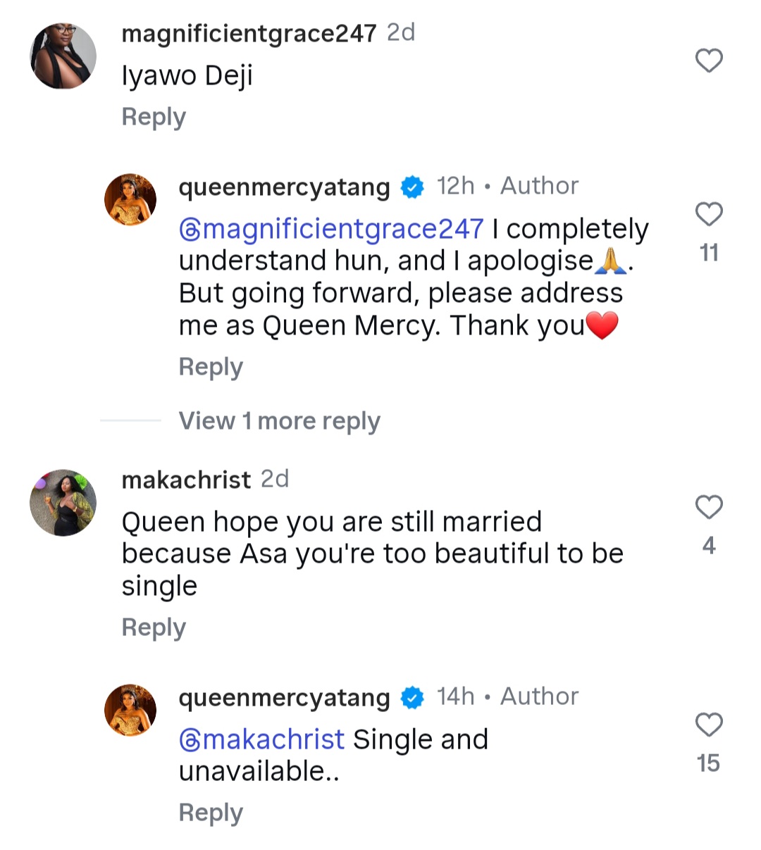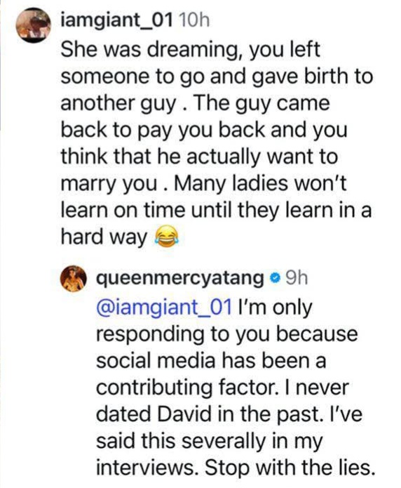 Queen Mercy Atang has reacted for the for the first time to rumours of her dating history with estranged David Oyekanmi. When Mercy married David Oyekanmi in 2024, shortly after welcoming a child with content creator Lord Lamba, there were reports claiming David was her ex but she left him, only to return to him after being ignored by her baby daddy. Now, with Mercy announcing that she and David’s marriage is over, fans told her that David came back to marry her only to get back at her for dumping him previously.