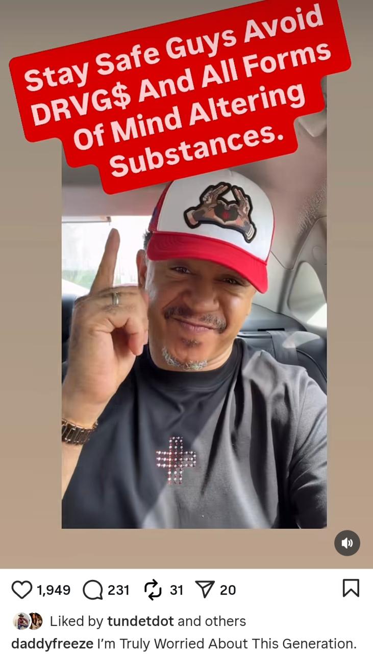 Daddy Freeze has expressed his worry for this generation. The media personality raised concern about the drug epidemic following his explosive live interviews with singers Tuface Idibia and Jessie Jags. In a recent interview with Tuface’s former manager, Kaka told Freeze that both Tuface and his wife Natasha have been abusing drugs. Tuface later joined the live interview to blast Kaka but ended up engaging in a fight with Natasha while live. Later, Jessie Jags joined Freeze’s live to defend Tuface and he also seemed out of sorts during the interview, with viewers suggesting he was under the influence. Tuface has now warned people to stay away from substances that alter the mind. He wrote: “Stay safe guys. Avoid drvg$ and all forms of mind altering substances.” He added: “I’m truly worried about this generation.” The post “I’m truly worried about this generation” Daddy Freeze says amid after interview with Tuface and Jessie Jags appeared first on Linda Ikeji Blog.