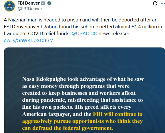 A Nigerian national, Nosa Edokpaigbe, was sentenced to 60 months in federal prison in the United States, ordered to pay $1,408,897.16 in restitution, and a forfeiture money judgement totaling $681,694 after pleading guilty to one count of wire fraud and agreeing to the entry of a stipulated judicial removal order.   The United States Attorneys Office for the District of Colorado made the announcement in a statement issued by the Department of Justice on Thursday, December 4, 2025.  After serving his sentence, Edokpaigbe will be deported to Nigeria. According to the plea agreement, from around July 2020 and until around May 2021, Edokpaigbe prepared and submitted hundreds of fraudulent Economic Injury Disaster Loan (EIDL) and Paycheck Protection Program (PPP) applications on behalf of fictitious business entities using personal identifying information belonging to other real individuals.  To conceal his involvement in the fraud, Edokpaigbe signed loan agreements in other names, created fabricated documents for the fictitious entities, used a wireless hotspot to conceal his online activity, and used AI-generated images and images of mannequins to bypass the lenders identity verification procedures. The hotspot was seized from the defendants residence at the time of his arrest in October 2023.  He also submitted one fraudulent EIDL in his own name and filed hundreds of fraudulent tax returns using personal identifying information belonging to other real individuals. As a result of the scheme, $1,389,713 was paid out in EIDL and PPP loans, the majority of which was deposited into bank accounts opened using false identities. While others were struggling to make ends meet during the COVID-19 pandemic, Nosa Edokpaigbe saw the national emergency as an opportunity to fleece American taxpayers out of almost $1.4 million, said United States Attorney Peter McNeilly. His shameless exploitation of relief programs which were supposed to be a lifeline for people in need has earned him several years in federal prison and a one-way trip back to Nigeria. Nosa Edokpaigbe took advantage of what he saw as easy money through programs that were created to keep businesses and workers afloat during the pandemic, misdirecting that assistance to line his own pockets, said Marv Massey, Acting Special Agent in Charge of FBI Denver. His greed affects every American taxpayer, and the FBI will continue to aggressively pursue opportunists who think they can defraud the federal government. United States District Judge Regina M. Rodriguez presided over the sentencing. The investigation was conducted by the Federal Bureau of Investigation Denver Field Office and the Cybercrime Investigations Division of the Treasury Inspector General for Tax Administration. Assistant United States Attorneys Nicole Cassidy and Anna Edgar handled the prosecution.The post Nigerian man sentenced to 60 months imprisonment for $1.3m COVID-19 related fraud in US appeared first on Linda Ikeji Blog.