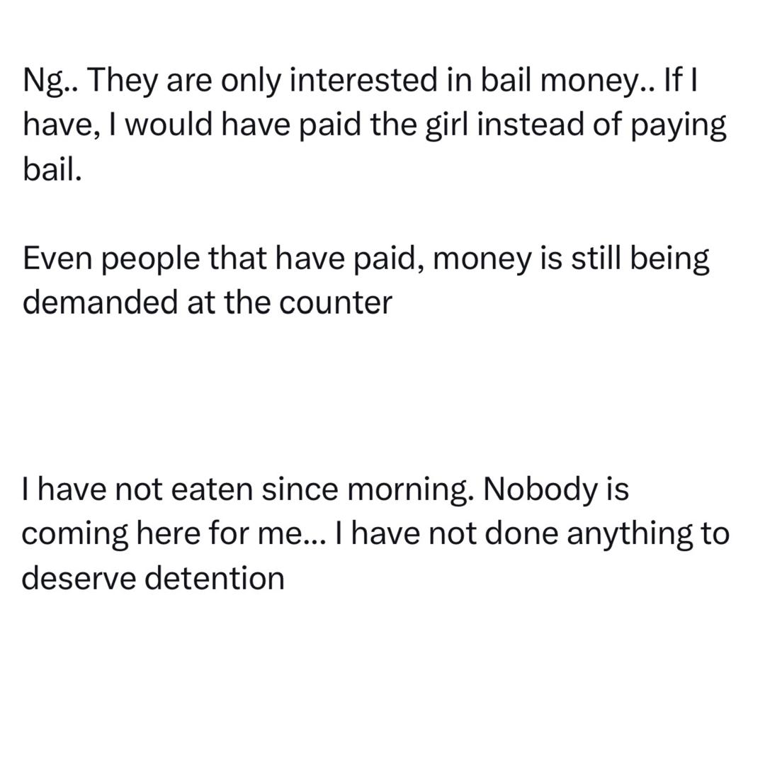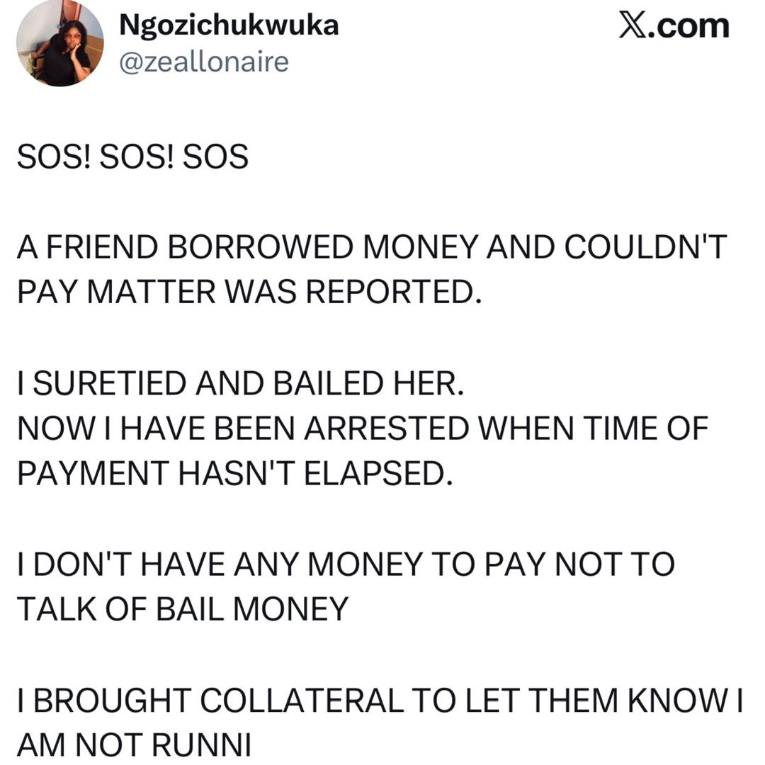 A Nigerian Lady took to social media to cry for help after she was arrested over money owed by a friend. In a series of posts on X, the lady with the handle @zeallonaire said a while back, a friend of hers was arrested over an unpaid debt. She said she got involved, stood as a surety for her friend and even paid the N30, 000 bail for her release. The X-user said to her surprise, she got arrested over the said debt even though the date set for the repayment of debt had not yet come. She mentioned that her friend in question is out of town. The spokesperson of the Delta state police command, SP Bright Edafe, has weighed into the incident with a view of getting her out of custody.
