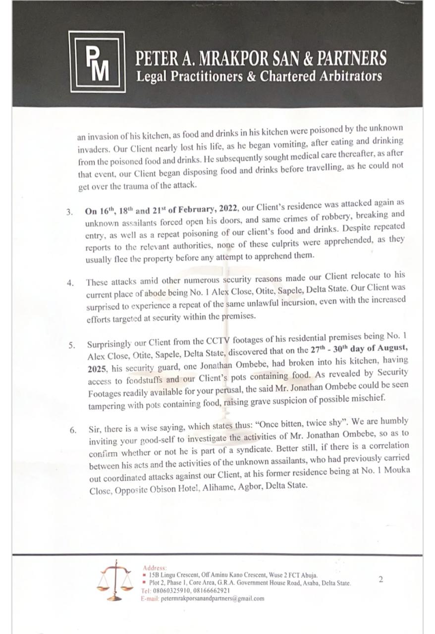A Delta businessman, Mr Emmanuel Mouka (pictured above), has petitioned the Inspector General of police to investigate his security guard over fears of a conspiracy spanning from attacks in 2022 where similar incidents occurred which he reported to the police but was instead detained. Mr Mouka, who lives in Delta State, stated in the petition written by his solicitors, Hon.Peter Mrakpor SAN, the honorable former Attorney General of Delta State, that he installed security cameras to ensure the security of lives and properties within his premises in Otite, Sapele, Delta State. He added that he also employed a security personnel from a security company. He explained that he did these due to his experience at his previous property, where his residence, also in Delta State, was attacked multiple times by unknown assailants and his kitchen invaded in 2022. He said he nearly lost his life to food poisoning following one incident as “foods and drinks in his kitchen were poisoned by the unknown invaders” (read here). The attacks at his previous property made him relocate to his current place at No. 1 Alex Close in Otite. However, he claims recent footage from the CCTV he installed showed that between 27th to 30th August 2025, his security guard, Jonathan Ombebe, had broken into his kitchen, having access to foodstuffs and his pots containing foods. Mr Mouka said his security guard’s action raises grave suspicion of possible conspiracy and he called on the police to investigate to see if his security guard is part of a syndicate or if there is a correlation between his acts and the activities of the unknown assailants, who had previously carried out coordinated attacks against him at his previous residence. He is also calling on the family of Happy Uboh who gained access to his premises on April 19, 2022, after telling him that he was sick via SMS to review the CCTV footage of the kind of attacks he was experiencing that made him go to the police station to report after finding Happy Uboh inside his gated premises. He says it is unfair and wrong for him to be accused while still facing such attacks after the accusation against him.Read the full petition to the police and watch the video below