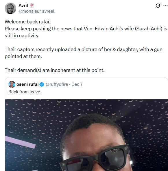 Terrorists have released a picture of the abducted wife and daughter of slain Kaduna Anglican priest with gun pointed at them. LIB reported that Ven. Edwin Achi, his wife Sarah and their daughter were abducted from their residence in Chikun Local Government Area on October 28, 2025. The terrorists threatened to k!ll the victims if their family failed to pay N200 million ransom. The abductors killed the priest before the ultimatum lapsed and later released a picture of him and his wife on his Facebook page. A family member, Avril, confirmed the latest development on X while addressing journalist Rufai Oseni. Please keep pushing the news that Ven. Edwin Achi’s wife Sarah Achi is still in captivity. Their captors recently uploaded a picture of her and daughter, with a gun pointed at them. Their demands are incoherent at this point, he wrote. Posting a heart wrenching photo of the victims on Wednesday, he wrote: This is not a country.”