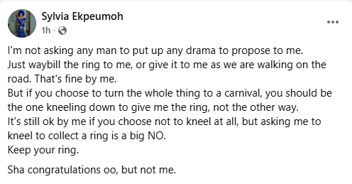 A Nigerian lady, Sylvia Ekpeumoh, has said she would rather her man waybills an engagement ring to her than make her kneel to accept his proposal. She stated this while reacting to a viral photo of a Nigerian lady who chose to kneel while her man proposed marriage to her. I’m not asking any man to put up any drama to propose to me. Just waybill the ring to me, or give it to me as we are walking on the road. That’s fine by me. But if you choose to turn the whole thing to a carnival, you should be the one kneeling down to give me the ring, not the other way. It’s still ok by me if you choose not to kneel at all, but asking me to kneel to collect a ring is a big NO. Keep your ring. Sha congratulations oo, but not me, she wrote in a Facebook post on Thursday.