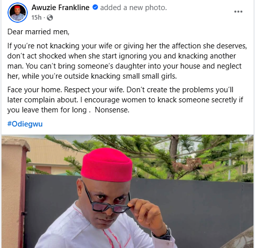 A Nigerian man, Awuzie Franklin, has said he’s been facing some heat after he encouraged married women to get secret lovers if their husbands refuse to have s3x with them. According to him, many “unfaithful husbands” have been telling him to pull down the post. He further berated the men who run after young girls, leaving their wives unsatisfied. Since I made a post encouraging married women to secretly get a man who will be knackin them if their husbands abandon them, many unfaithful husbands are in my inbox telling me to pull the post down. I wont pull it down.. I want all married women whose husbands refused to satisfy to open their legs 360% for another man and lets another man dig the abandoned Kpekus. No mercy him. Na only you blood dey run for vein. Nonsense, he wrote in a Facebook post on Wednesday. “Dear married men, If youre not knacking your wife or giving her the affection she deserves, dont act shocked when she start ignoring you and knacking another man. You cant bring someones daughter into your house and neglect her, while youre outside knacking small small girls. Face your home. Respect your wife. Dont create the problems youll later complain about. I encourage women to knack someone secretly if you leave them for long . Nonsense.”