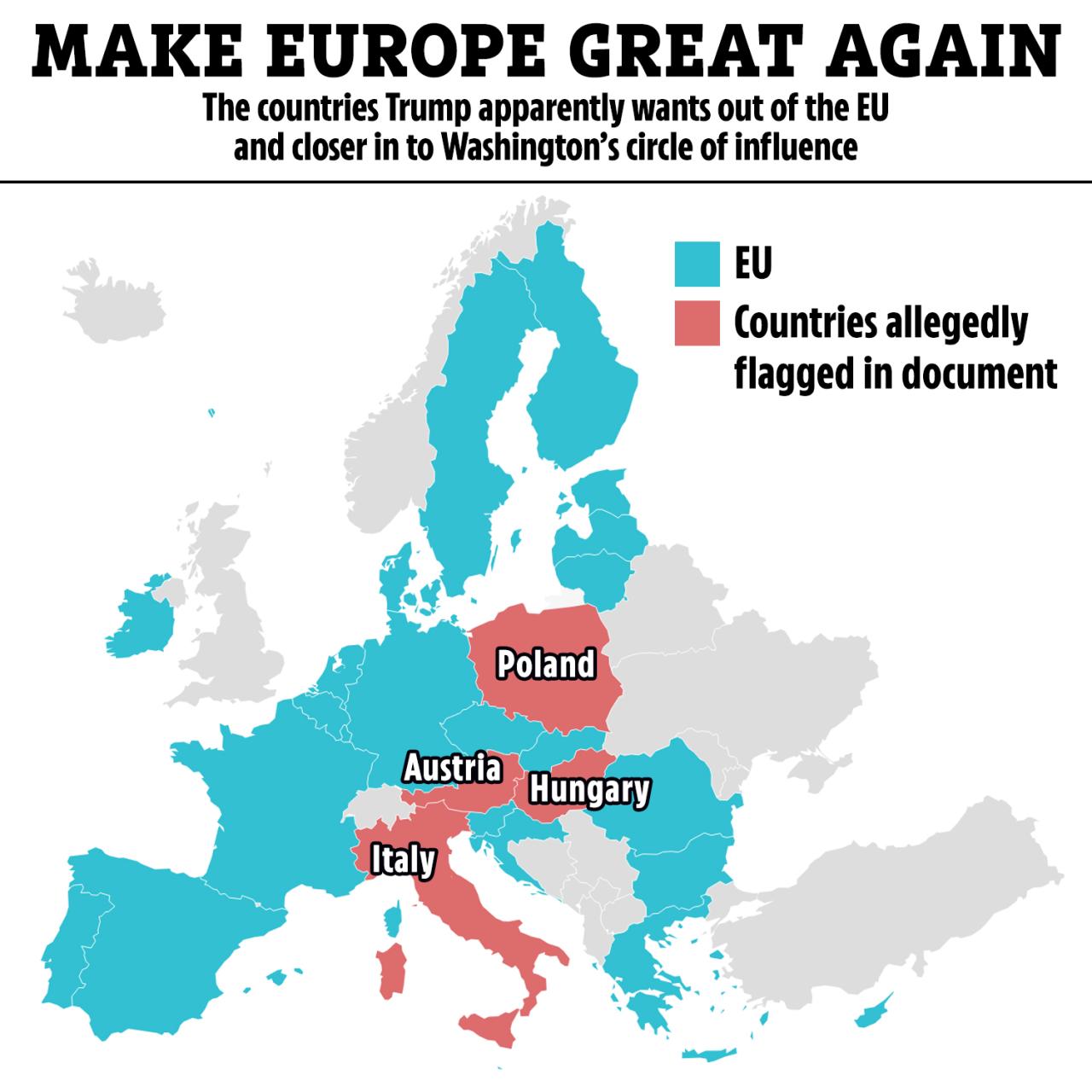 Washington reportedly wants to see four countries leave the European Union as part of a dramatic new Make Europe Great Again strategy under Donald Trump, according to a leaked document that has triggered shockwaves across Europe. The alleged full draft of the National Security Strategy claims the United States should encourage Austria, Italy, Hungary and Poland to move closer into the American orbit by quitting the bloc altogether. A partial version of the NSS released last week had already sparked outrage after warning of civilisational erasure in Europe due to what it described as destructive open migration and censorship policies. But the unpublished draft seen by US outlet Defense One goes even further, suggesting Washington should work more withthe goal of pulling [the four countries] away from the [European Union], backing governments and movements that seek sovereignty and preservation/restoration of traditional European ways of life. The leak emerged just days after the official 33 page strategy stunned European governments with blunt claims that some longstanding allies may no longer be reliable partners. Despite anger across the EU, the White House stood firmly behind its published version. Deputy press secretary Anna Kelly said: President Trump is transparent and has signed a national security strategy that clearly directs the US government to implement its established principles and priorities. According to Defense One, the unpublished draft outlines an overhaul in the US approach to Europe, portraying Brussels as an institution that erodes sovereignty, restricts freedoms and fuels instability through mass migration. It surfaced in the midst of an already tense atmosphere following Trumps renewed attacks on EU policies. In interviews this week, he said Europes leaders were destroying their countries through migration, claiming some nations were falling apart. The leak also escalated tensions between Washington and Europe as the two sides disputed strategy over the war in Ukraine. Trump recently disclosed that strong words were exchanged during a call with German Chancellor Friedrich Merz, UK Prime Minister Keir Starmer and French President Emmanuel Macron. Merz acknowledged there had been friction but said more discussions were planned and hinted at a potential meeting next week. The countries named in the alleged US strategy align closely with Trumps strongest political allies in Europe. He has repeatedly praised Hungarys Prime Minister Viktor Orban, exempted Budapest from certain sanctions over Russian energy, and maintained close relations with Polands President Karol Nawrocki. Trump has also spoken warmly of Italys Giorgia Meloni, describing her as a fantastic woman who has taken Europe by storm. Austria, under Chancellor Christian Stocker, reportedly rounds out the list of countries the US aims to bring closer.