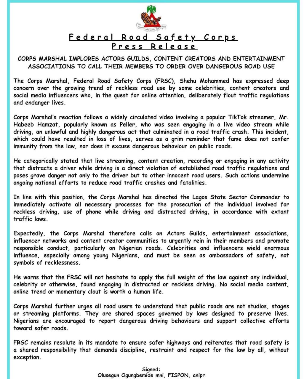 The Federal Road Safety Corps (FRSC) has announced plans to prosecute popular TikTok streamer, Mr. Habeeb Hamzat, widely known as Peller, over alleged reckless and distracted driving. The decision follows a viral video in which the influencer was seen live streaming while drivingan act the FRSC said reportedly resulted in a road traffic crash. This was disclosed in a statement issued on Monday by the Assistant Corps Marshal and Corps Public Education Officer, Mr. Olusegun Ogungbemide. Im scared, Im really scared! Peller breaks down in tears after crashing his new car following another heated argument with Jarvis. pic.twitter.com/z1ZeCsIcz5 Linda Ikeji Blog (@lindaikeji) December 14, 2025 According to the statement, the Corps Marshal expressed deep concern over what he described as a growing trend of reckless road use by celebrities, social media influencers, and content creators who, in the pursuit of online attention, flout traffic regulations and endanger lives. He stressed that live streaming, recording, or engaging in any form of content creation while driving is a clear violation of traffic laws and poses serious risks to both drivers and other road users.