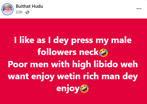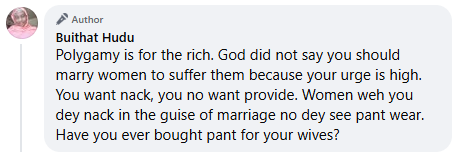 A Nigerian Muslim woman, Buithat Hudu Muhammad Lawal has taken a dig at poor men who marry multiple women they can’t provide for because of high libido.  Polygamy is for the rich. God did not say you should marry women to suffer them because your urge is high. You want nack, you no want provide. Women weh you dey nack in the guise of marriage no dey see pant wear. Have you ever bought pant for your wives?, she wrote in a Facebook post on Sunday.  Poor men with high libido weh want enjoy wetin rich man dey enjoy.   The post Polygamy is for the rich. God did not say you should marry women to suffer them – Nigerian Muslim woman writes as she takes a dig at “poor men with high libido” appeared first on Linda Ikeji Blog.