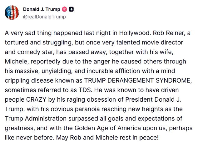 Nick is reportedly in custody and has been booked for murdr after the couple were found stabbed to de@th. Trump took to social media on Monday morning, claiming that Reiners long-standing and highly public criticism of him was the true reason behind the couples de@ths. The former president described the tragedy as a Trump Derangement Syndrome. ‘Rob Reiner, a tortured and struggling, but once very talented movie director and comedy star, has passed away, together with his wife, Michele, reportedly due to anger he caused others through his massive, unyielding, and incurable affliction with a mind crippling disease known as TRUMP DERANGEMENT SYNDROME,’ the president wrote. ‘He was known to have driven people CRAZY by his raging obsession of President Donald J. Trump, with his obvious paranoia reaching new heights as the Trump Administration surpassed all goals and expectations of greatness.’