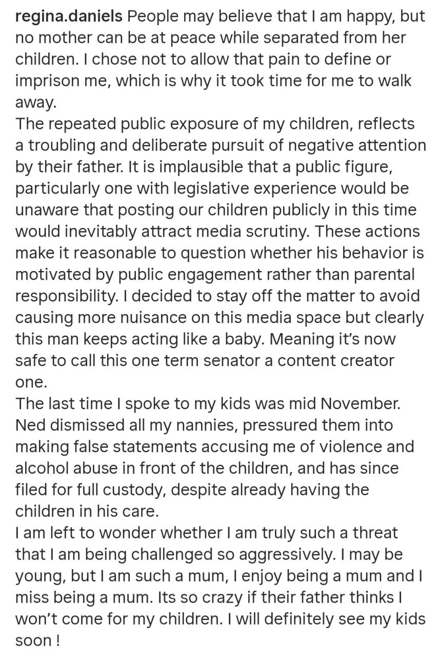 Regina Daniels has revealed how much she misses her children and she accused her estranged husband of using the custody of her sons to fight her. The actress shared a video showing her speaking to her sons during a video call. She stated that she has not been able to talk to her kids since mid November,  after she left her marriage and accused husband Ned Nwoko of domestic violence. She accused Ned of devising different tactics to keep the kids from her. She then warned him that she will come for her kids. She wrote in the caption:  “People may believe that I am happy, but no mother can be at peace while separated from her children. I chose not to allow that pain to define or imprison me, which is why it took time for me to walk away. “The repeated public exposure of my children, reflects a troubling and deliberate pursuit of negative attention by their father. It is implausible that a public figure, particularly one with legislative experience would be unaware that posting our children publicly in this time would inevitably attract media scrutiny. “These actions make it reasonable to question whether his behavior is motivated by public engagement rather than parental responsibility. I decided to stay off the matter to avoid causing more nuisance on this media space but clearly this man keeps acting like a baby. Meaning its now safe to call this one term senator a content creator one. “The last time I spoke to my kids was mid November. Ned dismissed all my nannies, pressured them into making false statements accusing me of violence and alcohol abuse in front of the children, and has since filed for full custody, despite already having the children in his care. “I am left to wonder whether I am truly such a threat that I am being challenged so aggressively. “I may be young, but I am such a mum, I enjoy being a mum and I miss being a mum. Its so crazy if their father thinks I wont come for my children. I will definitely see my kids soon!”  Watch video below.      View this post on Instagram           A post shared by Lindaikejiblog (@lindaikejiblogofficial) The post “No mother can be at peace while separated form her children” Regina Daniels laments as she calls out husband over custody appeared first on Linda Ikeji Blog.