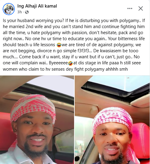 A Ghanaian polygamist, Alhaji Ali Kamal, has advised women who constantly fight their husbands for taking second wives to either accept the situation or leave the marriage. In a Facebook post on Wednesday, Kamal, who has two wives, said none has the time to educate women who hate polygamy. Is your husband worrying you? If he is disturbing you with polygamy.. If he married 2nd wife and you can’t stand him and continue fighting him all the time, u hate polygamy with passion, don’t hesitate, pack and go right now.. No one hv ur time to educate you again.. Your bitterness life should teach u life lessons, we are tired of de against polygamy, we are not begging, divorce n go simple … De kwasiasem be tooo much…. Come back if u want, stay if u want but if u can’t, just go.. No one will complain wai.. Byeeeeee. At dis stage in life paaa h still see women who claim to hv senses dey fight polygamy ahhhh smh, he wrote.