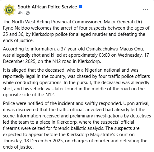 Four traffic police officers were arrested for m8rder of a 37-year-old Nigerian man in South Africa. The deceased identified as 37-year-old Osinakachukwu Marcus Onu, who was legally in the country, was shot and k!lled on Wednesday, December 17, 2025 on the N12 in Klerksdorp. The traffic officers, aged between 25 and 36 years old, are members of the national traffic department (RTM road traffic management). It is alleged that he was chased by four traffic police officers while conducting operations. In the pursuit, the deceased was allegedly shot, and his vehicle was later found in the middle of the road on the opposite side of the N12. His body was found in the middle of the road. Police were notified of the incident and swiftly responded. Upon arrival, it was discovered that the traffic officials involved had already left the scene. Information received and preliminary investigations by detectives led the team to a place in Klerksdorp, where the suspects official firearms were seized for forensic ballistic analysis. The suspects are expected to appear in the Klerksdorp Magistrates Court on Thursday December 18 on charges of m8rder and defeating the ends of justice. The North West Acting Provincial Commissioner, Major General (Dr) Naidoo commended the Klerksdorp Detectives police for their swift and effective response. Additionally, he thanked those who assisted the police with information that led to the arrest to ensure that justice is served.