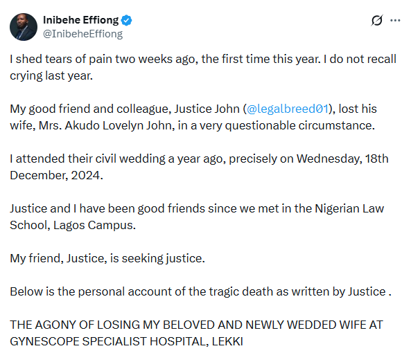 Human Rights lawyer, Inibehe Effiong, has taken to social media to demand justice for his friends wife who passed away in a Lagos hospital from alleged medical negligence during childbirth. In a post shared on X, Inibehe said the incident moved him to tears after his friend, Justice John gave a detailed account of how his wife, Akudo John, lost her life after she welcomed their baby on December 3 at a hospital in the Lekki area of Lagos state. He wroteI shed tears of pain two weeks ago, the first time this year. I do not recall crying last year. My good friend and colleague, Justice John (@legalbreed01), lost his wife, Mrs. Akudo Lovelyn John, in a very questionable circumstance. I attended their civil wedding a year ago, precisely on Wednesday, 18th December, 2024. Justice and I have been good friends since we met in the Nigerian Law School, Lagos Campus. My friend, Justice, is seeking justice. Below is the personal account of the tragic death as written by Justice . THE AGONY OF LOSING MY BELOVED AND NEWLY WEDDED WIFE AT GYNESCOPE SPECIALIST HOSPITAL, LEKKI My wife went to Gynescope Specialist Hospital, Lekki for childbirth and died from mismanaged Primary Postpartum Hemorrhage (PPH). The same hospital where she registered and had her antenatal care without any underlying illness. In her third trimester, during one of the antenatal visits, the Consultant and attending doctor, Dr. Joseph Aliyu Yahaya, disclosed the considerable size of the baby. We raised concerns regarding safe delivery options and the possibility of an elective Cesarean Section (CS) owing to the fetal size. The Consultant dismissed CS and insisted on SVD. On Wednesday, 3rd December 2025, my wife went into labour. The Consultant performed episiotomy on my her, and our baby was delivered weighing 4.2KG. Immediately after delivery, the consultant left the labour ward and my wifes episiorrhaphy was done by his subordinate. My wife complained of a dripping sensation inside her body. After observation, the Consultant noted that the vulva was unusually swollen and the sutures were too tight. The Consultant re-sutured her. After this second procedure, my wife looked lifeless, pale, and unconscious for hours, while the bleeding continued unabated. The Consultant confirmed she was bleeding internally yet took no active steps in referring or seeking specialist help outside the primary facility. There was a clear 15-hour window between the delivery of our baby and my wifes eventual passing. Blood transfusion was done without first identifying and repairing the source of bleeding. At about 3:00 a.m. on Thursday, 4th December 2025, my wife complained of discomfort and began convulsing. It is important to note that at this critical moment, no medical personnel were in sight. Minutes after I screamed for help, doctors and nurses arrived from the ground floor. There was notably no oxygen in the ward where my wife was admitted. At this time, I requested for a transfer of my wife to another facility, but the Consultant said no facility would accept her without a pulse. Minutes later, the Consultant then agreed for her to be moved. MY OBSERVATIONS DURING THE EVACUATION OF MY WIFE Firstly, the Hospital brought a stretcher without side guards or straps to evacuate my wife. While moving her, she fell off the stretcher onto the hard floor of the tiled walkway on the 3rd floor. (I have challenged the Hospital to release the undoctored CCTV footage of the 3rd floor showing when my wife was being stretched out in the early hours of Thursday, 4th December 2025). I rushed to help lift her back up. The staff seemed confused about whether to use the stairs or elevator, thereby wasting valuable time during such an emergency. Secondly, upon reaching the ground floor, I expected the ambulance to be positioned at the entrance of the hospital door, ready to receive her. Sadly, the ambulance was stationed about 80 metres away, still covered in a tarpaulin showing no readiness. Only then was the cover removed. When I asked the driver to open the ambulance, I heard the most shocking thing – the keys were with Human Resources (HR) Manager. It took considerable time to retrieve the keys. When the driver finally opened the bus, he stated he needed to connect the battery. Throughout this chaos, my wife lay in the open on a stretcher, unattended and without oxygen.Thirdly, the ambulance finally took off. I insisted the Consultant accompany her as the most experienced personnel available. I drove behind the ambulance, which stopped twice on the way. Upon reaching Lagos Island from Ikate, a trip of about 15 minutes giving the time of the night, I noticed the ambulance appeared lost. I overtook them to inquire, and a nurse informed me they were heading to “Marina.” Suspecting they meant a government hospital on Broad Street, I then led them to Lagos Island Maternity Hospital (LIMH), where my wife was pronounced Dead on Arrival. LIMH issued a note for her body to be deposited at the General Hospital morgue. Gynescope Specialist Hospital reluctantly issued a death certificate claiming the cause of death was Cardiac Arrest. However, my wifes body was taken to the Lagos University Teaching Hospital (LUTH) for an autopsy as part of the Coroners Inquest. LUTH has now issued a death certificate clearly stating the cause of death to be Hemorrhagic Shock, directly contradicting the Hospitals claim. STEPS TAKENI have written to the Lagos State Government through the Hon. Commissioner for Health, Permanent Secretary, Ministry of Health and Permanent Secretary, Health Service Commission. I have also petitioned the Medical & Dental Council of Nigeria (MDCN), calling for a thorough investigation into the events of 3rd4th December 2025 at Gynescope Specialist Hospital, and the circumstances under which my wife painfully lost her life. Where applicable, appropriate sanctions and/or criminal prosecution be undertaken. I demand accountability. #MedicalNegligence#JusticeForLov