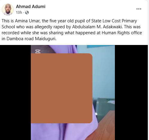 The Borno State Police Command has launched a manhunt for a suspect, who allegedly r@ped of a 5-year-old girl in the Low-Cost area of Maiduguri.   The spokesperson of the command, ASP Nahum Kenneth Daso, who disclosed this in a statement on Wednesday, December 16, 2025 dismissed reports that police had arrested and released the suspect identified as Abdulsalam M. Adakwaki.  According to the PPRO, the suspect r@ped the minor on November 13 while on her way to school.  The Borno State Police Command wishes to clarify issues arising from a social media post concerning an alleged case of sexual assault involving a 5yr old minor at State Low-Cost area of Maiduguri, the statement read. The Command confirms that a formal petition was received on 24/11/2025, regarding an incident that allegedly occurred on 13/11/2025 at about 9:00 a.m that a 5yr old Pupil was r@ped by one Abdulsalam M. Adakwaki AKA Yaro while on her way to school.  “Upon receipt of the report, the Command immediately commenced investigation through the State Criminal Investigation Department on the allegation. “Contrary to claims circulating on social media that the suspect was apprehended and subsequently released by the Police, the Command wishes to set the record straight that no arrest has been made in respect of this case. The suspect is currently at large, while Intensive efforts are ongoing to apprehend him. “The Command have engaged community leaders, including the Lawan, while the Civilian Joint Task Force (CJTF) has been requested to assist in locating and arresting the fleeing suspect. “In the interest of transparency, accountability, and public confidence, the investigation is being conducted under appropriate supervision, with room for monitoring and engagement by relevant Civil Society Organizations (CSOs), Non-Governmental Organizations (NGOs), and the National Human Rights Commission (NHRC), in line with established procedures. “The Command appeals to members of the public who may have credible information on the whereabouts of the suspect to promptly report to the nearest police station or assist in ensuring his arrest and handover to the Police for further action. Further updates will be communicated as developments unfold. Emergency Contacts: 08068075581, 08023473293.  The post Police launch manhunt for suspect over r@pe of 5-year-old girl in Borno appeared first on Linda Ikeji Blog.