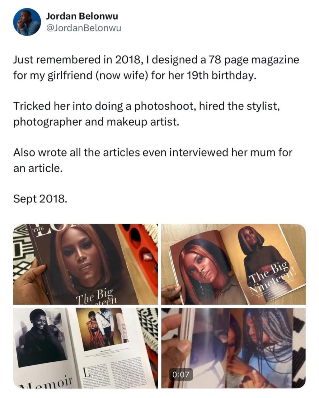 A man has shown the unique way he celebrated his girlfriend  now wife on her 19th birthday. The man created a magazine just for her with the front page bearing her photo and “The LOML” written on it. Other pages include photos of her and articles about her from interviews done with her loved ones. The man shared the magazine and wrote on X: “Just remembered in 2018, I designed a 78 page magazine for my girlfriend (now wife) for her 19th birthday. “Tricked her into doing a photoshoot, hired the stylist, photographer and makeup artist. “Also wrote all the articles even interviewed her mum for an article. Sept 2018.”    The post Man shows how he went all out for his wife’s 19th birthday when she was still his girlfriend appeared first on Linda Ikeji Blog.