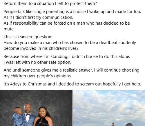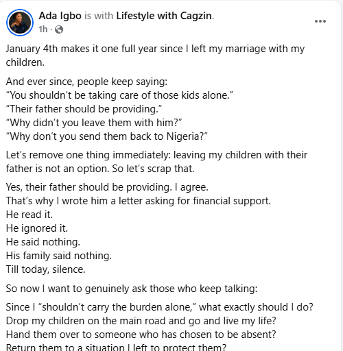 A Canada-based Nigerian woman, Ada, has spoken out after people questioned her decision to leave her marriage with four children and solely raise them. In a Facebook post on Sunday, December 21, 2025, the mother of four noted that since she left her marriage people have been telling her that she should have left the children behind while others advised her to send them to their father in Nigeria. She alleged that all efforts to make her estranged husband take responsibility for their children have failed, claiming that he never responded to her letters seeking financial support. However, she stressed that leaving her children with their father is not an option for her because she left the marriage to protect them. “January 4th makes it one full year since I left my marriage with my children,” she wrote. And ever since, people keep saying: You shouldnt be taking care of those kids alone. Their father should be providing. Why didnt you leave them with him? Why dont you send them back to Nigeria? Lets remove one thing immediately: leaving my children with their father is not an option. So lets scrap that. Yes, their father should be providing. I agree. Thats why I wrote him a letter asking for financial support. He read it. He ignored it. He said nothing. His family said nothing. Till today, silence. So now I want to genuinely ask those who keep talking: Since I shouldnt carry the burden alone, what exactly should I do? Drop my children on the main road and go and live my life? Hand them over to someone who has chosen to be absent? Return them to a situation I left to protect them? People talk like single parenting is a choice I woke up and made for fun. As if I didnt first try communication. As if responsibility can be forced on a man who has decided to be mute. This is a sincere question: How do you make a man who has chosen to be a deadbeat suddenly become involved in his childrens lives? Because from where Im standing, I didnt choose to do this alone. I was left with no other safe option. And until someone gives me a realistic answer, I will continue choosing my children over peoples opinions. Its 4 days to Christmas and I decided to scream out hopefully I get help.
