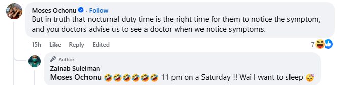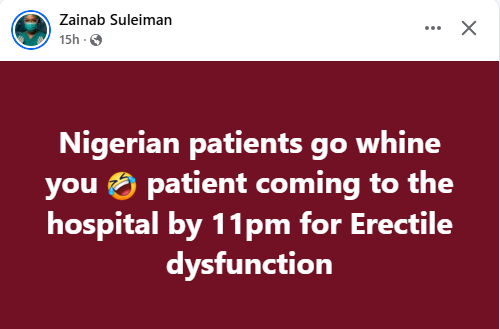 A Nigerian doctor, Zainab Suleiman, has reacted after a patient came to the hospital at almost midnight to complain of erectile disfunction. Nigerian patients go whine you patient coming to the hospital by 11pm for erectile dysfunction, she wrote in a Facebook post on Saturday.