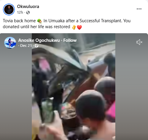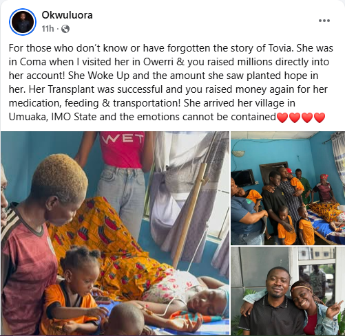A Nigerian woman, Tovia, reunited with her family amid tears, cries of joy and embraces after a successful kidney transplant. A friend, Anosike Ogochukwu, on Sunday shared a celebratory video showing the heartwarming and emotional moment Tovia reunited with her children, mother and other family members in her hometown. According to Anosike, when Tovia was diagnosed with kidney disease after giving birth to her twins, her husband abandoned her for another woman. Tovia spoke out from her hospital bed, appealing to Nigerians to come to her aid so she could live a normal life again and take care of her children. Through media personality, Okwuluora, well meaning Nigerians raised money for the kidney transplant. “Drop your congratulations. If you are on TikTok you will know my friend. Her kidneys failed while giving birth to her twins.Her husband moved on with another lady in less than a year. Was even posting the girl on his status, a status his wife still views. My friend will call me everyday crying. She came out and cried to the public through the help of Okwulora. Nigerians raised money for her. And today she is back, back to her mother alive. Watch the video and drop your congratulations. Kidney transplant successfully done, she wrote.