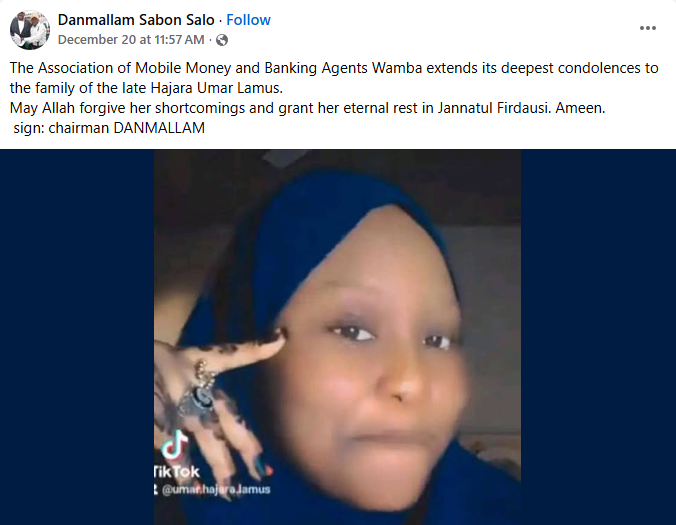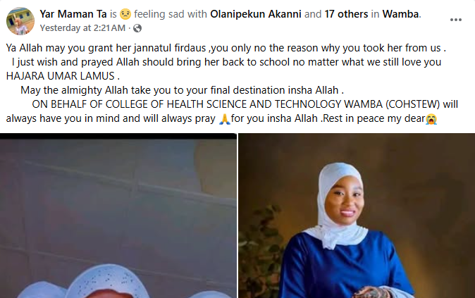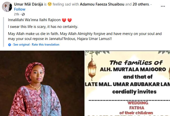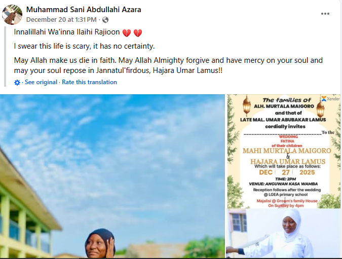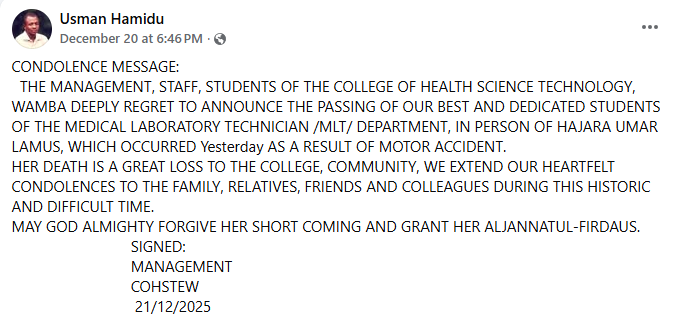 A Nigerian woman, Hajara Umar Lamus, has d!ed in a motor accident seven days to her wedding in Nasarawa State. It was gathered that the deceased was travelling from Lafia to Wamba in Nasarawa when the accident occurred on December 20, 2025. According to the wedding invite, Hajara was set to marry her man, Mahi Murtala Maigoro on December 27. The sudden loss has thrown her family, friends, and loved ones into deep mourning. Many have described her death as a painful reminder of the unpredictability of life. “Innalillahi Wa’inna Ilaihi Rajioon, I swear this life is scary, it has no certainty. May Allah make us die in faith. May Allah Almighty forgive and have mercy on your soul and may your soul repose in Jannatul’firdous, Hajara Umar Lamus!,” one Muhammad Sani wrote. Until her untimely death, Hajara was a student of the College of Health Science and Technology Wamba (COHSTEW).