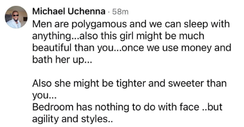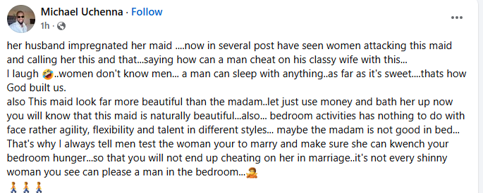 A Nigerian man, Michael Uchenna, has mocked Ada Igbo, after she accused her estranged husband of impregnating their maid. Commenting on her post, Michael stated that men are polygamous in nature and can sleep with anything as long as it’s sweet. He mocked Ada, saying that the maid might be tighter, sweeter and better in bed than her. Taking to his Facebook page, he claimed that the maid also looks more beautiful than Ada. “Her husband impregnated her maid. Now in several posts have seen women attacking this maid and calling her this and that…saying how can a man cheat on his classy wife with this,” he wrote. I laughwomen don’t know men… a man can sleep with anything as far as it’s sweet….that’s how God built us. Also this maid look far more beautiful than the madam. Let just use money and bath her up now you will know that this maid is naturally beautiful. Also, bedroom activities has nothing to do with face rather agility, flexibility and talent in different styles. May be the madam is not good in bed. That’s why I always tell men test the woman your to marry and make sure she can kwench your bedroom hunger…so that you will not end up cheating on her in marriageit’s not every shinny woman you see can please a man in the bedroom.