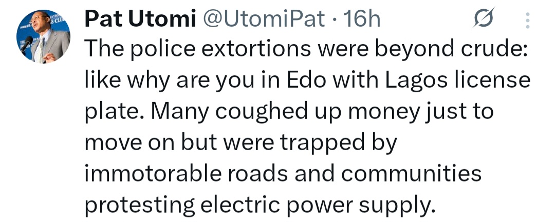 Pat Utomi, a former presidential aspirant, has recounted his journey from Lagos to Asaba which lasted for longer than it should have due to multiple factors. Utomi blamed bad roads and crude police extortion for making him spend 15 hours on the road for a journey that should have taken way less time. He wrote on X: “My car left Lagos at  5am. It has just arrived Asaba after 8pm. It had no breakdowns. It made Benin  at 10.30. That was a 3hour drive in the 80s. But the real news is that it took 6hours to cross Benin. From police trying to extort money to terribly bad roads detty Dec got dirty. The police extortions were beyond crude: like why are you in Edo with Lagos license plate. Many coughed up money just to move on but were trapped by immotorable roads and communities protesting electric power supply. The post Former presidential aspirant, Pat Utomi slams “crude” police extortion along road as he recounts his journey from Lagos to Asaba appeared first on Linda Ikeji Blog.