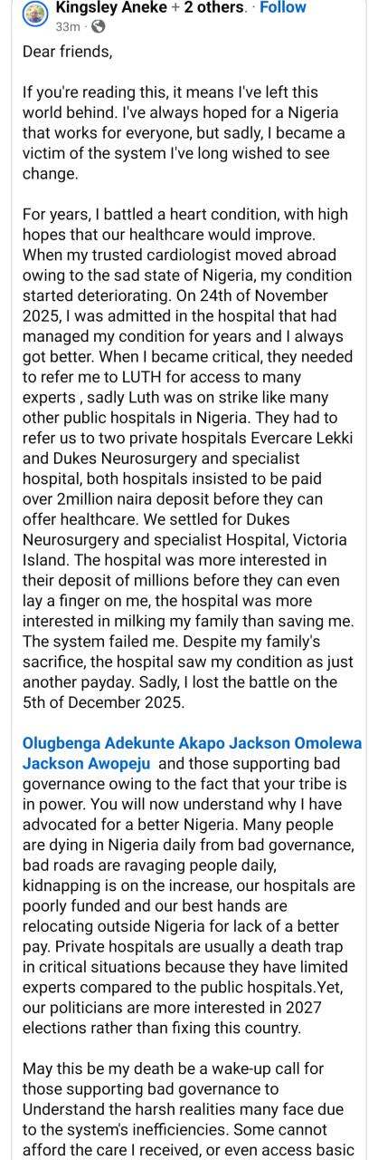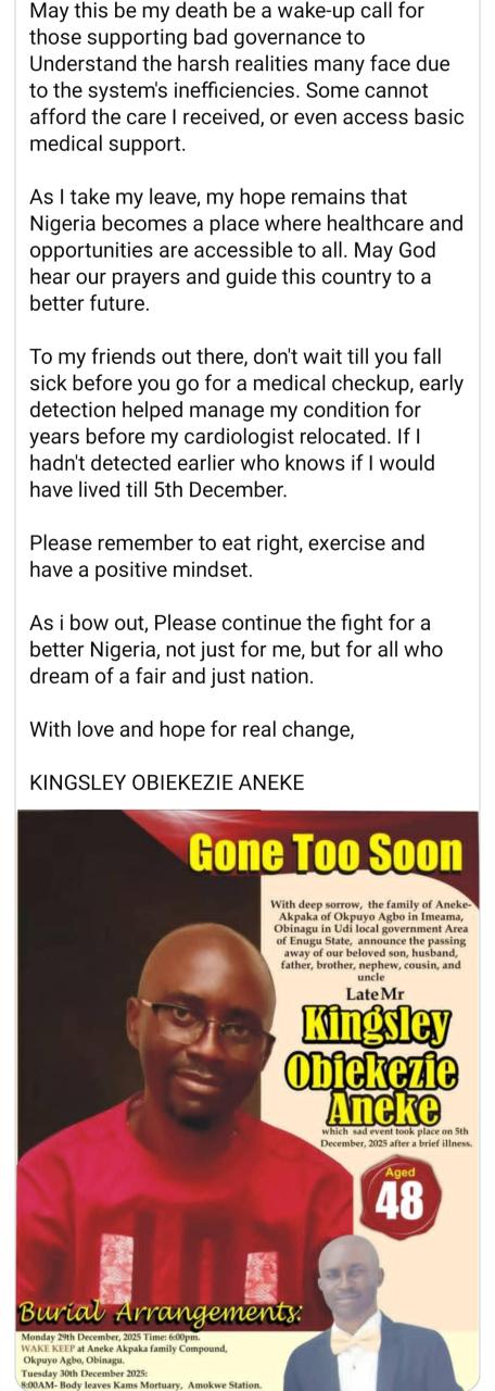 A Nigerian man has did while fighting for a better country and he penned his own obituary which has now been published. Kingsley Aneke did on Dec. 5, 2025, at the age of 48 after battling a heart condition. Before his demise, Kingsley used to advocate for a better Nigeria via his social media accounts. He wrote his de@th announcement and it was published today, Dec. 23, on Facebook. It reads: “Dear friends, “If you’re reading this, it means I’ve left this world behind. I’ve always hoped for a Nigeria that works for everyone, but sadly, I became a victim of the system I’ve long wished to see change. “For years, I battled a heart condition, with high hopes that our healthcare would improve. When my trusted cardiologist moved abroad owing to the sad state of Nigeria, my condition started deteriorating. “On 24th of November 2025, I was admitted in the hospital that had managed my condition for years and I always got better. When I became critical, they needed to refer me to LUTH for access to many experts , sadly Luth was on strike like many other public hospitals in Nigeria. “They had to refer us to two private hospitals Evercare Lekki and Dukes Neurosurgery and specialist hospital, both hospitals insisted to be paid over 2million naira deposit before they can offer healthcare. We settled for Dukes Neurosurgery and specialist Hospital, Victoria Island. “The hospital was more interested in their deposit of millions before they can even lay a finger on me, the hospital was more interested in milking my family than saving me. “The system failed me. Despite my family’s sacrifice, the hospital saw my condition as just another payday instead of prioritising my wellbeing, they kept billing until the last minute. Sadly, I lost the battle on the 5th of December 2025.” He went on to call out those who defend poor governance. He wrote: “Olugbenga Adekunte Akapo Jackson Omolewa Jackson Awopeju and those supporting bad governance owing to the fact that your tribe is in power. You will now understand why I have advocated for a better Nigeria. Many people are dying in Nigeria daily from bad governance, bad roads are ravaging people daily, kidnapping is on the increase, our hospitals are poorly funded and our best hands are relocating outside Nigeria for lack of a better pay. “Private hospitals are usually a death trap in critical situations because they have limited experts compared to the public hospitals.Yet, our politicians are more interested in 2027 elections rather than fixing this country. “May this my death be a wake-up call for those supporting bad governance to Understand the harsh realities many face due to the system’s inefficiencies. Some cannot afford the care I received, or even access basic medical support. “As I take my leave, my hope remains that Nigeria becomes a place where healthcare and opportunities are accessible to all. May God hear our prayers and guide this country to a better future. “To my friends out there, don’t wait till you fall sick before you go for a medical checkup, early detection helped manage my condition for years before my cardiologist relocated. If I hadn’t detected earlier who knows if I would have lived till 5th December.”Please remember to eat right, exercise and have a positive mindset. “As i bow out, Please continue the fight for a better Nigeria, not just for me, but for all who dream of a fair and just nation. “With love and hope for real change, KINGSLEY OBIEKEZIE ANEKE.”