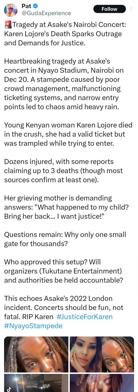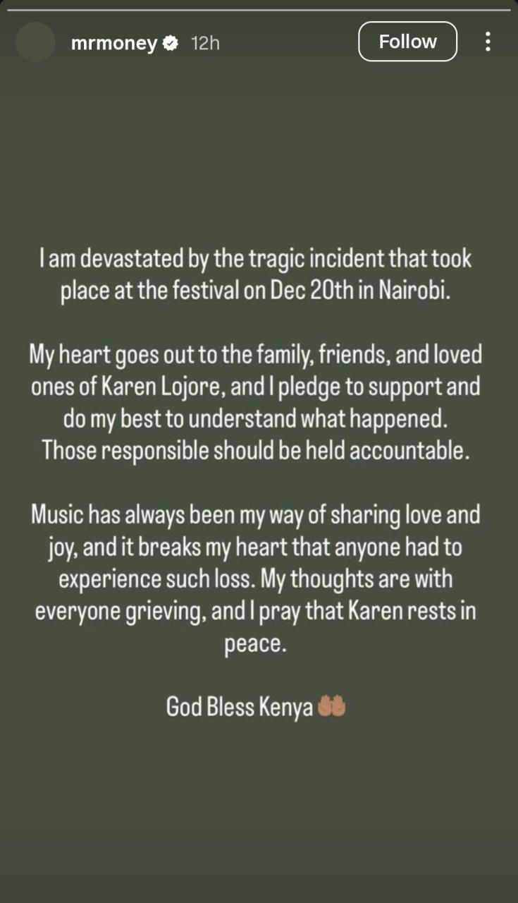 Reacting, Asake wrote on his Instagram Stories: “I am devastated by the tragic incident that took place at the festival on Dec 20th in Nairobi. “My heart goes out to the family, friends. and loved ones of Karen Lojore, and I pledge to support and do my best to understand what happened. “Those responsible should be held accountable. “Music has always been my way of sharing love and joy. and it breaks my heart that anyone had to experience such loss. “My thoughts are with everyone grieving, and I pray that Karen rests in peace. “God Bless Kenya.”