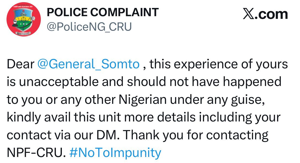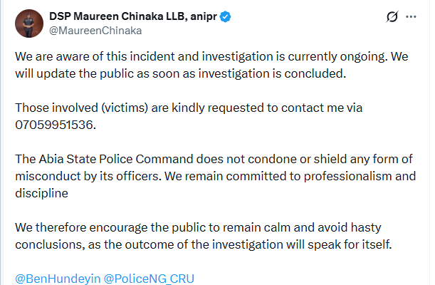 The Nigeria Police Complaint unit has reacted to a viral video showing a lady crying out for help after some police officers allegedly ass@ulted her and her family members while travelling to the East,Yesterday, around 3pm, I was illegally detained and ass@ulted by officers of the Nigeria Police Force. I was forcefully taken from Aba to Umuahia against my will. My phone was seized, preventing me from calling anyone for help. This was a clear abuse of power and violation of my rights.While being transported, the officer driving my vehicle was reckless, dangerously overtaking a police bus, This reckless action led to a serious accident. The car lost control, spun and crashed into the bush.My vehicle was badly damaged and my life was put at risk.This incident is completely unacceptable and I am calling on the Abia state government to immediately investigate this incident, hold the officers involved fully accountable, take responsibility for the damage to my vehicle.” the man who owned the vehicle wrote on social media Reacting to the viral video, the Police complaint unit via its X handle condemned the action of the police. It wroteThis experience of yours is unacceptable and should not have happened to you or any other Nigerian under any guise, kindly avail this unit more details including your contact via our DM. Thank you for contacting NPF-CRU. #NoToImpunity”Also reacting, the spokesperson of the Abia state police command, DSP Maureen Chinaka, wroteWe are aware of this incident and investigation is currently ongoing. We will update the public as soon as investigation is concluded. Those involved (victims) are kindly requested to contact me via 07059951536. The Abia State Police Command does not condone or shield any form of misconduct by its officers. We remain committed to professionalism and discipline We therefore encourage the public to remain calm and avoid hasty conclusions, as the outcome of the investigation will speak for itself.”