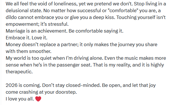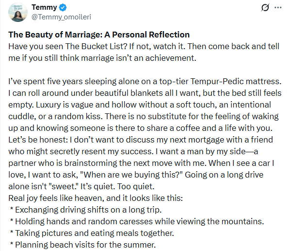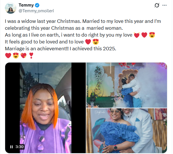A Canada-based Nigerian woman, Temmy Omoileri, who remarried five years after the d3ath of her husband has said that marriage is an achievement. The healthcare worker, who disclosed this on Christmas Day, shared photos from her wedding ceremony, saying that nothing comes close to the feeling of being loved and to love. I was a widow last Christmas. Married to my love this year and I’m celebrating this Christmas as a married woman. As long as I live on earth, I want to do right by you my love. It feels good to be loved and to love. Marriage is an achievement!! I achieved this in 2025, she wrote. Reacting to criticisms that trailed her assertion that ;marriage is an achievement’, she reiterated her stance, saying that after spending five years alone, there is no substitute for the feeling of waking up beside her husband, eating meals together, holding hands, going on long trips and making plans. According to her, no matter how successful a person is, a dildo cannot replace the emotional and physical intimacy of a human partner. Have you seen The Bucket List? If not, watch it. Then come back and tell me if you still think marriage isnt an achievement. Ive spent five years sleeping alone on a top-tier Tempur-Pedic mattress. I can roll around under beautiful blankets all I want, but the bed still feels empty. Luxury is vague and hollow without a soft touch, an intentional cuddle, or a random kiss. There is no substitute for the feeling of waking up and knowing someone is there to share a coffee and a life with you, she wrote. “Lets be honest: I dont want to discuss my next mortgage with a friend who might secretly resent my success. I want a man by my sidea partner who is brainstorming the next move with me. When I see a car I love, I want to ask, “When are we buying this?” Going on a long drive alone isn’t “sweet.” Its quiet. Too quiet. Real joy feels like heaven, and it looks like this: * Exchanging driving shifts on a long trip. * Holding hands and random caresses while viewing the mountains. * Taking pictures and eating meals together. * Planning beach visits for the summer. We all feel the void of loneliness, yet we pretend we don’t. Stop living in a delusional state. “No matter how successful or “comfortable” you are, a dildo cannot embrace you or give you a deep kiss. Touching yourself isn’t empowerment; its stressful. Marriage is an achievement. Be comfortable saying it. Embrace it. Love it. Money doesnt replace a partner; it only makes the journey you share with them smoother. My world is too quiet when Im driving alone. Even the music makes more sense when hes in the passenger seat. That is my reality, and it is highly therapeutic. 2026 is coming. Dont stay closed-minded. Be open, and let that joy come crashing at your doorstep. I love you all.