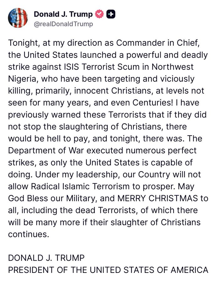 US President, Donald Trump said on Christmas day hed ordered a deadly strike on Islamic State terrorists in Nigeria, who he has accused of persecuting Christians in the country. Tonight, at my direction as Commander in Chief, the United States launched a powerful and deadly strike against ISIS Terrorist Scum in Northwest Nigeria, who have been targeting and viciously killing, primarily, innocent Christians, at levels not seen for many years, and even Centuries! the president wrote on Truth Social. I have previously warned these Terrorists that if they did not stop the slaughtering of Christians, there would be hell to pay, and tonight, there was, he went on. The Department of War executed numerous perfect strikes, as only the United States is capable of doing.Under my leadership, our Country will not allow Radical Islamic Terrorism to prosper. May God Bless our Military, and MERRY CHRISTMAS to all, including the dead Terrorists, of which there will be many more if their slaughter of Christians continues, the president concluded. Trump has focused for the last several months on the plight of Christians in Nigeria, including calling in November on his secretary of defense to prepare for possible action and warning the US would enter Nigeria guns-a-blazing to protect the Christian population of Africas most populous country.