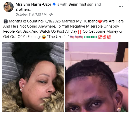 An American woman, Mrs Erin Harris-Uzor, who is married to a Nigerian man has revealed that her top resolution and goal for 2026 is divorce She disclosed this on Tuesday, December 30, 2025, two months after she addressed haters, saying that her husband isn’t going anywhere. The couple got married in August 2025.   The post “Divorce” – American woman shares her top resolution for 2026 four months after she married her Nigerian husband appeared first on Linda Ikeji Blog.