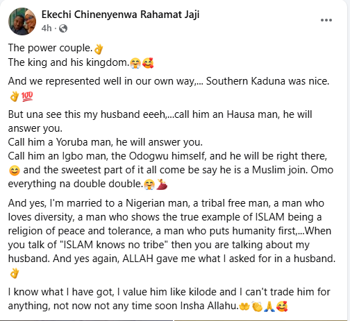 A Nigerian woman, Ekechi Rahamat Chinenyenwa Jaji, who converted to Islam, has hailed her Muslim husband, Barrister Muhammad Jaji, describing him as a detribalised Nigerian. Ekechi, from Enugu State, married Jaji, from Plateau State, in 2025. According to her, Muhammad is a true example of Islam being a religion of peace and tolerance. Sharing their photos from a visit to Southern Kaduna, Ekechi reiterated her love for Muhammad, saying she won’t trade him for for anything “The power couple. The king and his kingdom. And we represented well in our own way,… Southern Kaduna was nice. But una see this my husband eeeh,…call him an Hausa man, he will answer you. Call him a Yoruba man, he will answer you,” she wrote. “Call him an Igbo man, the Odogwu himself, and he will be right there, and the sweetest part of it all come be say he is a Muslim join. Omo everything na double double. “And yes, I’m married to a Nigerian man, a tribal free man, a man who loves diversity, a man who shows the true example of ISLAM being a religion of peace and tolerance, a man who puts humanity first,…When you talk of “ISLAM knows no tribe” then you are talking about my husband. And yes again, ALLAH gave me what I asked for in a husband. I know what I have got, I value him like kilode and I can’t trade him for anything, not now not any time soon Insha Allahu.