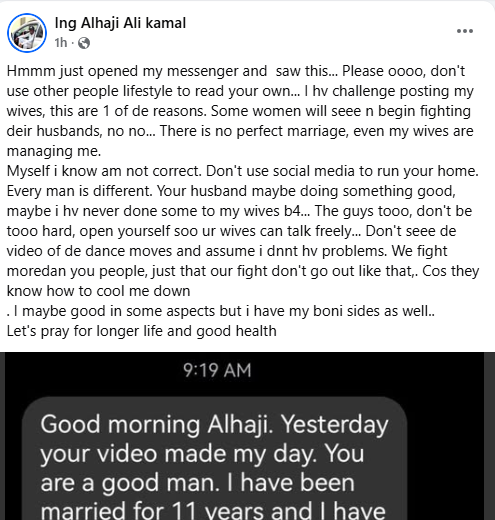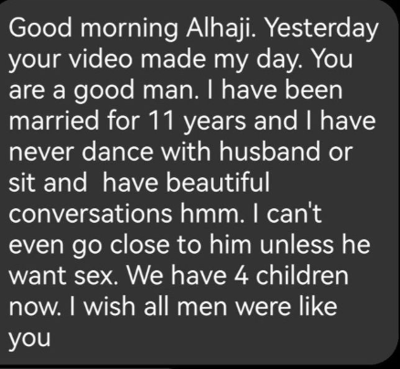 A Ghanaian man, Alhaji Ali Kamal, has shared a message he received from a woman who lamented that her husband is emotionally distant. The woman sent the message after Kamal posted a video of him dancing with his first wife. According to the woman, she’s been married for 11 years but has never danced with her husband or had meaningful conversations with him and cant even go close to him unless he wants s3x. Reacting to the message, Kamal advised couples not to avoid comparing their marriage to others as social media often presents curated and idealised versions of relationships. “Hmmm just opened my messenger and saw this… Please oooo, don’t use other people lifestyle to read your own… I have challenge posting my wives, this are 1 of the reasons. Some women will see and begin fighting their husbands, no no. There is no perfect marriage, even my wives are managing me.Myself I know am not correct,” he wrote. Don’t use social media to run your home. Every man is different. Your husband maybe doing something good, maybe I have never done some to my wives b4. The guys tooo, don’t be tooo hard, open yourself soo your wives can talk freely… Don’t seee de video of de dance moves and assume I don’t have problems. We fight more than you people, just that our fight don’t go out like that cos they know how to cool me down. I maybe good in some aspects but I have my boni sides as well. Let’s pray for longer life and good health.