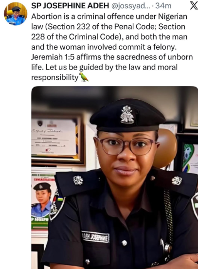 The FCT police command spokesperson, SP Josephine Adeh, has reminded Nigerians about the provisions of the law which prohibits abortion in Nigeria. In a post shared on X, Adeh mentioned that section 232 of the Penal Code and Section 228 of the Criminal Code criminalises the act of abortion and classifies it as a felony, punishable under the law for both the man and woman involved in it. Read what she wrote below..