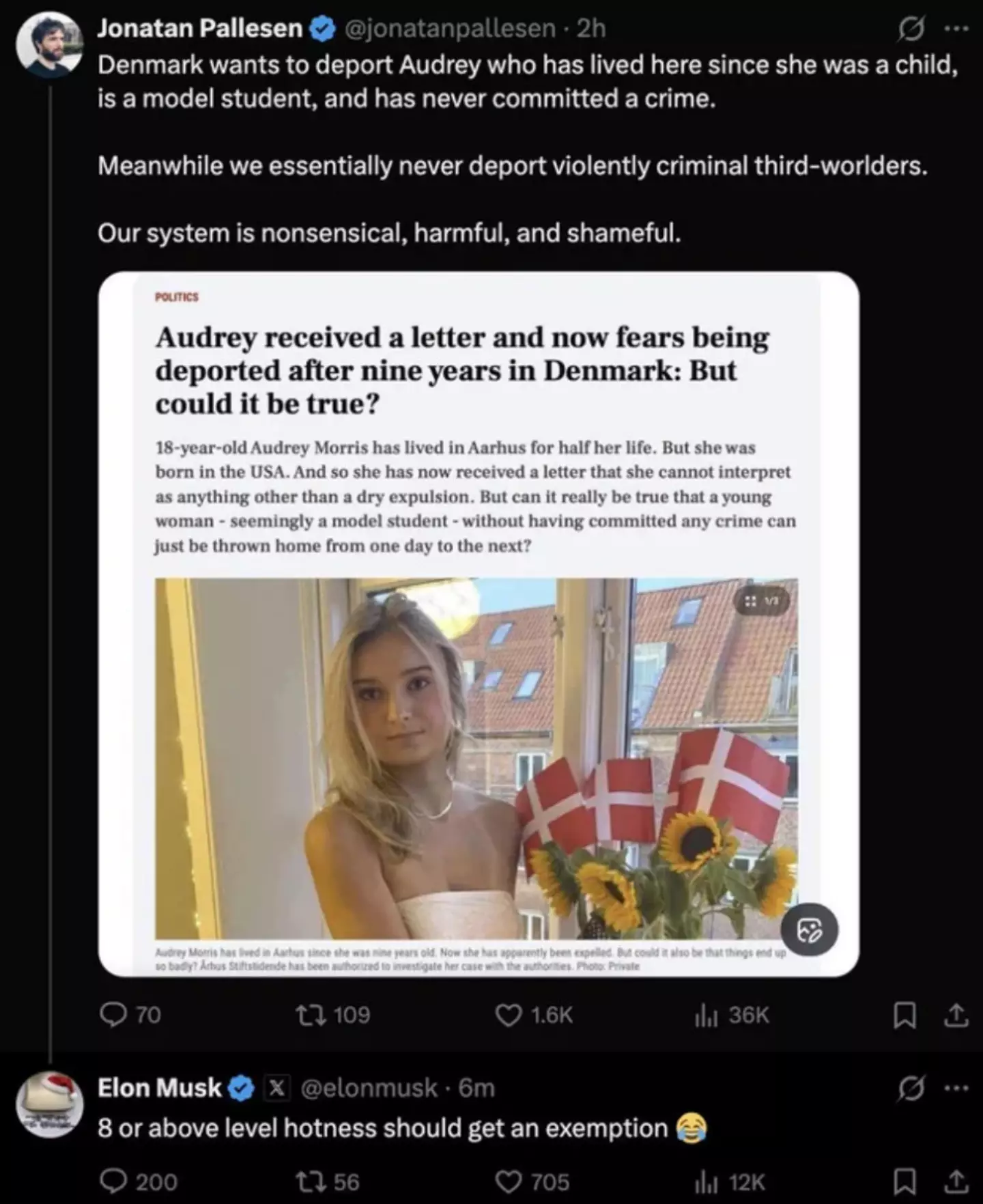 Elon Musk made a bizarre comment over a teen who is facing deportation. The Tesla CEO decided to comment on the situation of Audrey Morris, a teenage high school student from Los Angeles, who briefly faced deportation from her adopted home, Denmark. X user, Jonatan Pallesen had written on the microblogging platform: “Denmark wants to deport Audrey who has lived here since she was a child, is a model student, and has never committed a crime. “Meanwhile we essentially never deport violently criminal third-worlders “Our system is nonsensical, harmful, and shameful.” Elon Musk, 54, then commented on Morris’ fate by replying to Jonatan’s tweet. Musk wrote, 8 or above level hotness should get an exemption. Musk has been slammed for the comment, which many say is inappropriate. The post Elon Musk says teen should be exempted from deportation because she is “hot” appeared first on Linda Ikeji Blog.