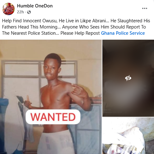 Police have arrested a 23-year-old man, identified as Innocent Owusu, for alleged m8rder of his father, Peter Owusu, aged 59, at Likpe Abrani in the Oti Region, Ghana. The police in a statement said the incident occurred on Tuesday, December 30, 2025, at the familys residence. Investigations indicate that the suspect beheaded his father and fled the scene. However, based on intelligence gathered by the Police, Innocent Owusu was later arrested at his hideout in a forest near Abrani. The police said the decapitated body and head of the deceased have since been recovered and deposited at the Hohoe Government Hospital Mortuary for preservation and autopsy. The suspect is currently in Police custody, assisting with ongoing investigations, and is expected to be processed in accordance with the law. The Oti Regional Police Command commended residents of Likpe Abrani for their swift cooperation and assistance, which contributed to the successful arrest of the suspect.