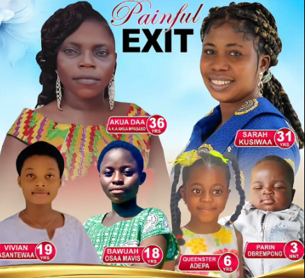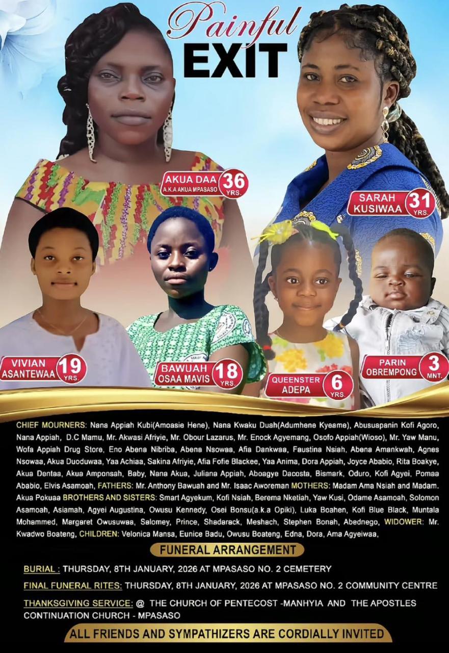 A family has announced the burial arrangements for six loved ones who lost their lives in a devastating fire outbreak in Ghana. The deceased, including a three-month old baby, were occupants in the seven-bedroom self-contained apartment at Abyakwa Manhyia, in the Ashanti Region, Ghana. Personnel of the Ghana National Fire Service received a distress call around 12:53 am on December 22, 2025 and a team from the Nkawie Fire Station rushed to the scene at 01:15 am to meet an advanced fire that was spreading rapidly. Information gathered indicated that firefighting operations were later reinforced by personnel from the Twedie Fire Station. Fortunately, the fire was brought under control at about 01:57 am and fully extinguished at 03:22am. Sadly, despite the swift response, the seven-bedroom residential building was completely destroye Firefighters retrieved six badly charred bodies burnt beyond recognition. A statement issued by the GNFS and signed by the Ashanti Regional Public Relations Officer, GNFS, DO II Peter Addai said the bodies was handed over to the Ghana Police Service for further investigations. It said the fire personnel managed to prevent the fire from extending to other adjoining properties The GNFS extended its deepest condolences to the bereaved family and noted that investigations had commenced to determine the cause of the fire. “The public is advised to avoid heavy burglar-proof doors and windows that trap occupants during emergencies,” the service advised. The victims identified as Aku Daa, 36, Sarah Kusiwaa, 31, Vivian Asantewaa, 19, Bawuah Osaa Mavis, 18, Queenster Adepa, 6, and Parin Obrempong, 3 months, will be laid to rest at Mpasaso on Thursday, January 8, 2026.