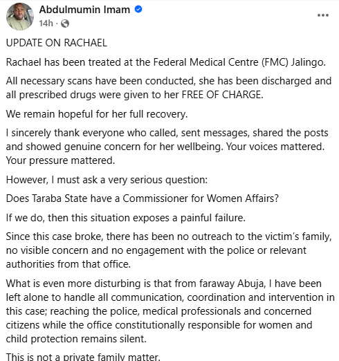 Taraba State Police Command has reportedly arrested one Mr. Haggai Ishaku following allegations that he assaulted his daughter, Rachael Haggai Ishaku. The minor reportedly sustained serious injuries, including a broken hand, after an assault at their residence behind the NLC Secretariat near Shimo FM. The arrest followed the intervention of human rights activist Abdulmumin Imam. The incident, allegedly triggered by the girls attendance at a church crossover service, has drawn public outrage. The suspect is currently in custody at the GRA Police Division, Jalingo. During questioning, Mr. Haggai told the police that he had warned his daughter that she was too young to have a boyfriend and accused her of associating with boys against his instructions. He further claimed that during the New Year crossover period, she did not attend a church crossover night but went elsewhere. However, the daughter, in an interview with Abdulmumin Imam and the police, refuted her fathers claims, stating that she attended the crossover night service. She also alleged that her father is in the habit of restraining them before beating them.