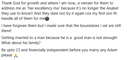 A Nigerian woman, Anabel Oluebube, who got married at the age of 18, has advised young girls to be financially and emotionally independent before settling down. She gave the advice while reacting to a post by a Nigerian lady, Okafor Oluchukwu, who narrated how her sister-in-law used to flog her in the early years of marriage. Sharing her experience as an 18-year-old wife, Anabel revealed that her husband was the breadwinner and his sisters didn’t hesitate to remind her that she came into their family with nothing. According to Anabel, she wasn’t allowed to share food after cooking or make separate meal for herself. You people should stop doubting that lady that said that her sis in-law was flogging her when she newly got married. My own experience as a 18 year old girl that got married to an extended familys breadwinner was almost the same! This is why you will always see me condemn early marriage, she wrote. I remember when my husband will give me money to cook for the whole family and my sis in-laws will tell me that they are the one to share the food when Im done cooking. They will take the big sizes of meat and leave me with little or none! I dare not cook a separate meal for myself cox every meal must be for the family and thats where I MUST eat from, if I complain they will as me how much I came with from zbl to Ihiala when I married their brother. Even after my first child, it continued that made me fight with one of them and I nearly comot her front teeth! They literally swore that I wont enjoy my marriage then oooo! Thank God for growth and where I am nowe remain for them to address me as her excellency ma because its no longer the Anabel they use to know!! And they dare not try it again cox my first son fit handle all of them for me. I have forgiven them but I made sure that the boundaries I set are still there! Getting married to a man because he is a good man is not enough! What about his family? Be up to 23 and financially independent before you marry any Adam please.