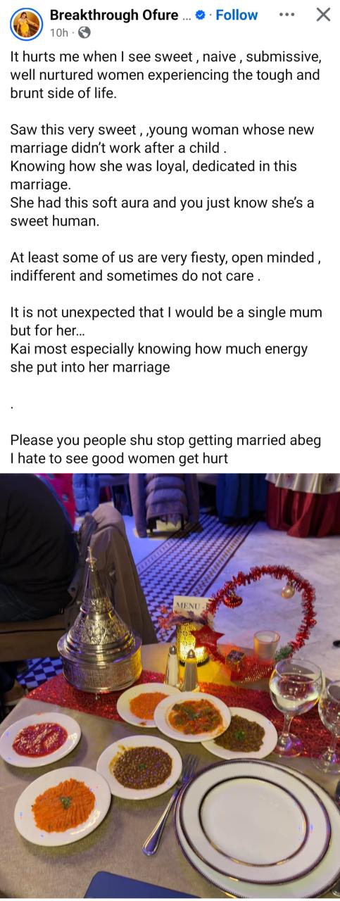 A mum has shared her pain at seeing “sweet” women get hurt in marriage and go through divorce. Ofure Kimberly stated that her being a single mum was expected because she is “feisty” and “sometimes doesn’t care”. However, she stated that women who are loyal and submissive are also ending up as single mothers after working hard to make their marriages work. She concluded by telling women to stop getting married so they won’t get hurt. She wrote: “It hurts me when I see sweet , naive, submissive, well nurtured women experiencing the tough and brunt side of life. “Saw this very sweet , young woman whose new marriage didnt work after a child . “Knowing how she was loyal, dedicated in this marriage. “She had this soft aura and you just know shes a sweet human. “At least some of us are very fiesty, open minded , indifferent and sometimes do not care . “It is not unexpected that I would be a single mum but for her “Kai most especially knowing how much energy she put into her marriage “Please you people shu stop getting married abeg “I hate to see good women get hurt.”