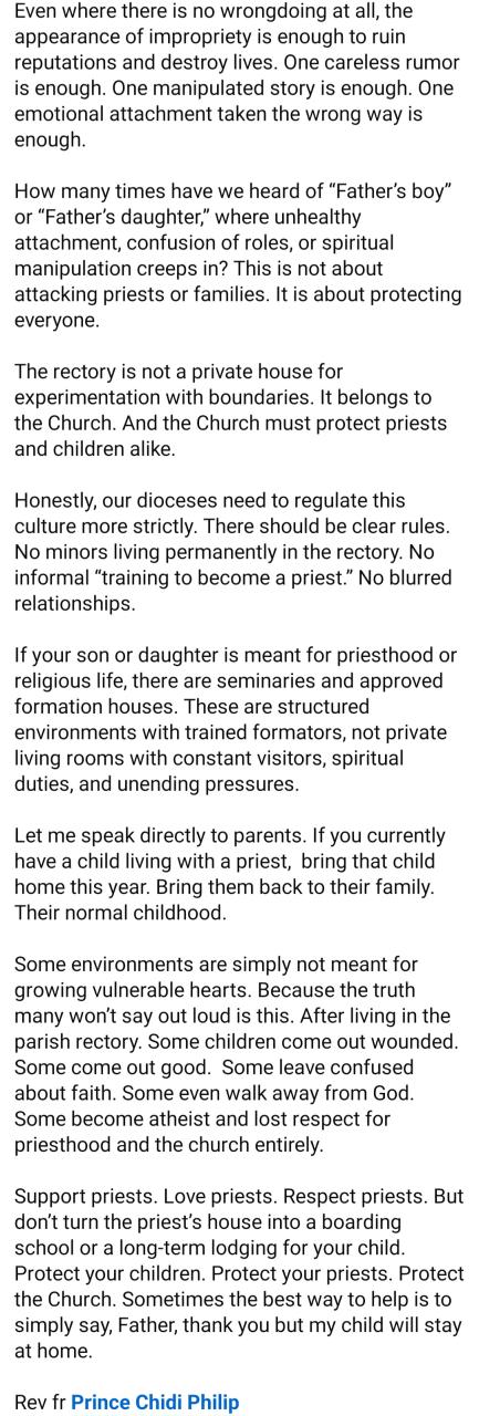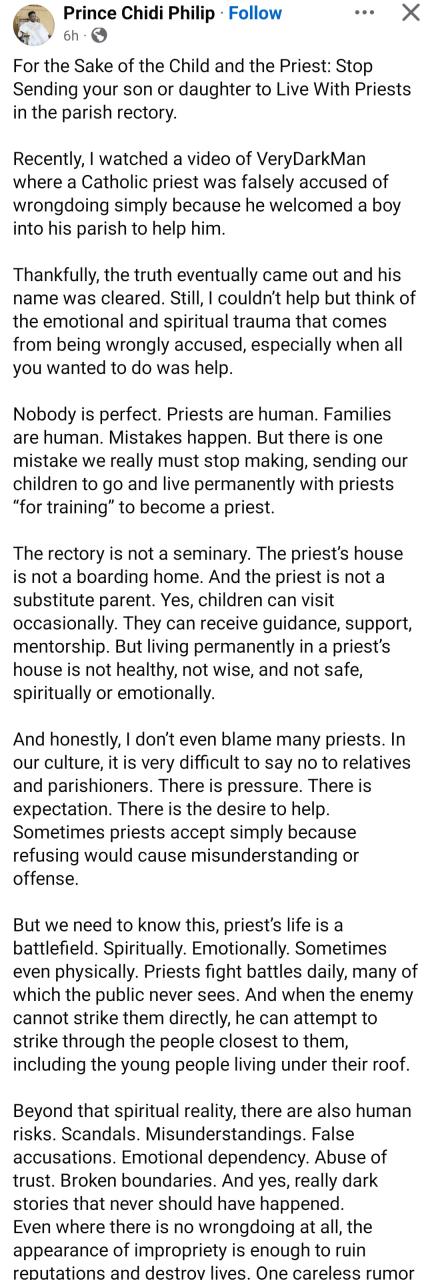 Chidi Philip, a Catholic Priest, was asked parents to stop sending their young daughters and sons to live with priests for “training”. He said this is necessary to avoid “mistakes”. He added that keeping children away from the parish rectory is a way to protect the children, the priests, and the church. He wrote: “For the Sake of the Child and the Priest: Stop Sending your son or daughter to Live With Priests in the parish rectory. “Recently, I watched a video of VeryDarkMan where a Catholic priest was falsely accused of wrongdoing simply because he welcomed a boy into his parish to help him. “Thankfully, the truth eventually came out and his name was cleared. Still, I couldnt help but think of the emotional and spiritual trauma that comes from being wrongly accused, especially when all you wanted to do was help. “Nobody is perfect. Priests are human. Families are human. Mistakes happen. But there is one mistake we really must stop making, sending our children to go and live permanently with priests for training to become a priest. “The rectory is not a seminary. The priests house is not a boarding home. And the priest is not a substitute parent. Yes, children can visit occasionally. They can receive guidance, support, mentorship. But living permanently in a priests house is not healthy, not wise, and not safe, spiritually or emotionally. “And honestly, I dont even blame many priests. In our culture, it is very difficult to say no to relatives and parishioners. There is pressure. There is expectation. There is the desire to help. Sometimes priests accept simply because refusing would cause misunderstanding or offense. “But we need to know this, priests life is a battlefield. Spiritually. Emotionally. Sometimes even physically. Priests fight battles daily, many of which the public never sees. And when the enemy cannot strike them directly, he can attempt to strike through the people closest to them, including the young people living under their roof. “Beyond that spiritual reality, there are also human risks. Scandals. Misunderstandings. False accusations. Emotional dependency. Abuse of trust. Broken boundaries. And yes, really dark stories that never should have happened.Even where there is no wrongdoing at all, the appearance of impropriety is enough to ruin reputations and destroy lives. One careless rumor is enough. One manipulated story is enough. One emotional attachment taken the wrong way is enough. “How many times have we heard of Fathers boy or Fathers daughter, where unhealthy attachment, confusion of roles, or spiritual manipulation creeps in? This is not about attacking priests or families. It is about protecting everyone. “The rectory is not a private house for experimentation with boundaries. It belongs to the Church. And the Church must protect priests and children alike. “Honestly, our dioceses need to regulate this culture more strictly. There should be clear rules. No minors living permanently in the rectory. No informal training to become a priest. No blurred relationships. “If your son or daughter is meant for priesthood or religious life, there are seminaries and approved formation houses. These are structured environments with trained formators, not private living rooms with constant visitors, spiritual duties, and unending pressures. “Let me speak directly to parents. If you currently have a child living with a priest, bring that child home this year. Bring them back to their family. Their normal childhood. “Some environments are simply not meant for growing vulnerable hearts. Because the truth many wont say out loud is this. After living in the parish rectory. Some children come out wounded. Some come out good. Some leave confused about faith. Some even walk away from God. Some become atheist and lost respect for priesthood and the church entirely.”Support priests. Love priests. Respect priests. But dont turn the priests house into a boarding school or a long-term lodging for your child. Protect your children. Protect your priests. Protect the Church. Sometimes the best way to help is to simply say, Father, thank you but my child will stay at home.”