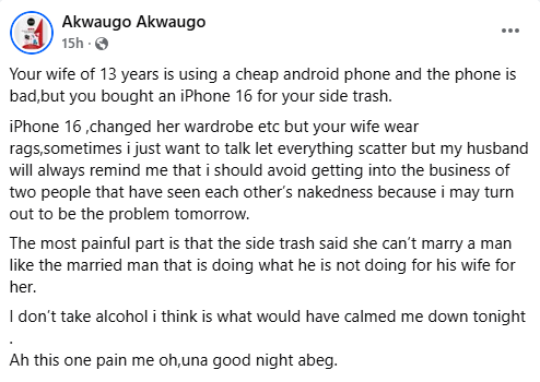 A Nigerian woman, Akwaugo, has berated a married acquaintance who she claimed spends money on his side chick while neglecting his wife. According to her, the man bought an iPhone 16 for his side piece, changed her wardrobe while his wife still uses a cheap android phone and wears rags. Akwaugo said she is tempted to confront the man but her husband advised her against interfering in other couple’s marital issues. Your wife of 13 years is using a cheap android phone and the phone is bad, but you bought an iPhone 16 for your side trash. iPhone 16, changed her wardrobe etc but your wife wears rags, sometimes I just want to talk, let everything scatter but my husband will always remind me that I should avoid getting into the business of two people that have seen each others nakedness because I may turn out to be the problem tomorrow. The most painful part is that the side trash said she cant marry a man like the married man that is doing what he is not doing for his wife for her. I dont take alcohol I think is what would have calmed me down tonight. Ah this one pain me oh, una good night abeg, she wrote in a Facebook post on Sunday.