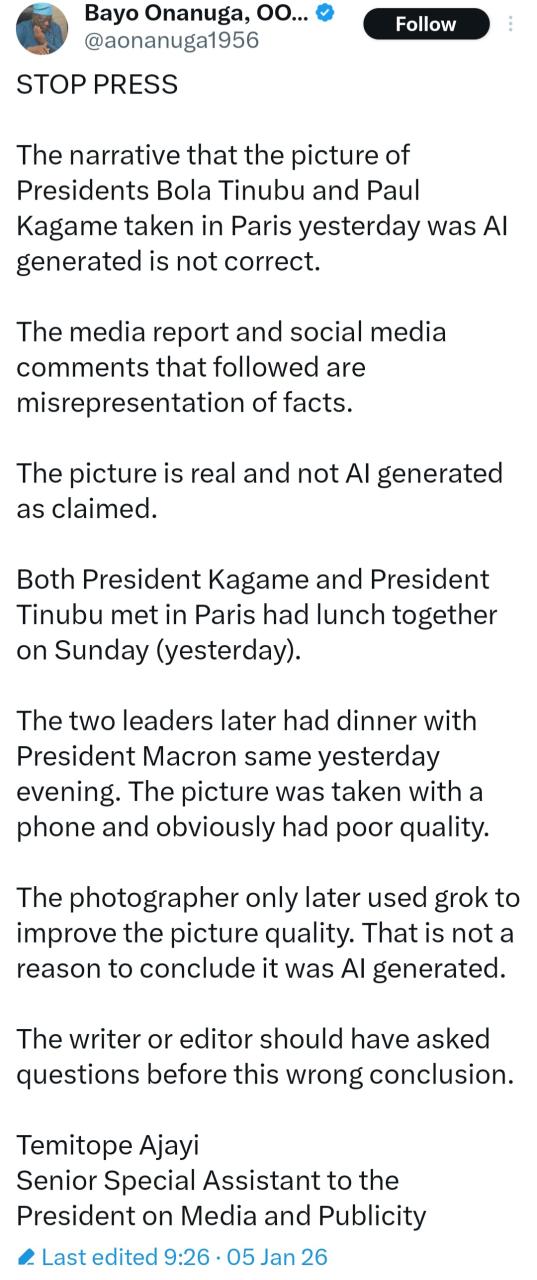 According to the Presidency, the picture, which was shared by Presidential spokesman, Mr. Bayo Onanuga, on his Facebook page, is genuine and was taken during an official engagement between the two leaders in Paris on Sunday, Jan. 4. The narrative that the picture of Presidents Bola Tinubu and Paul Kagame taken in Paris yesterday was AI generated is not correct, Ajayi said in a statement. The media report and social media comments that followed are misrepresentations of facts. Ajayi explained that Presidents Tinubu and Kagame met in Paris on Sunday, where they had lunch together before later joining French President Emmanuel Macron for dinner the same evening. He clarified that the photograph in question was taken with a mobile phone, which affected its initial quality. According to him, the image was later enhanced using digital tools to improve clarity, but this did not make it an AI-generated image. The picture is real and not AI generated as claimed. The photographer only later used Grok to improve the picture quality. That is not a reason to conclude it was AI generated, he stated. Ajayi criticised the reports that described the image as fake. The Presidency urged the media and members of the public to exercise caution and verify information before circulating claims that could mislead the public.