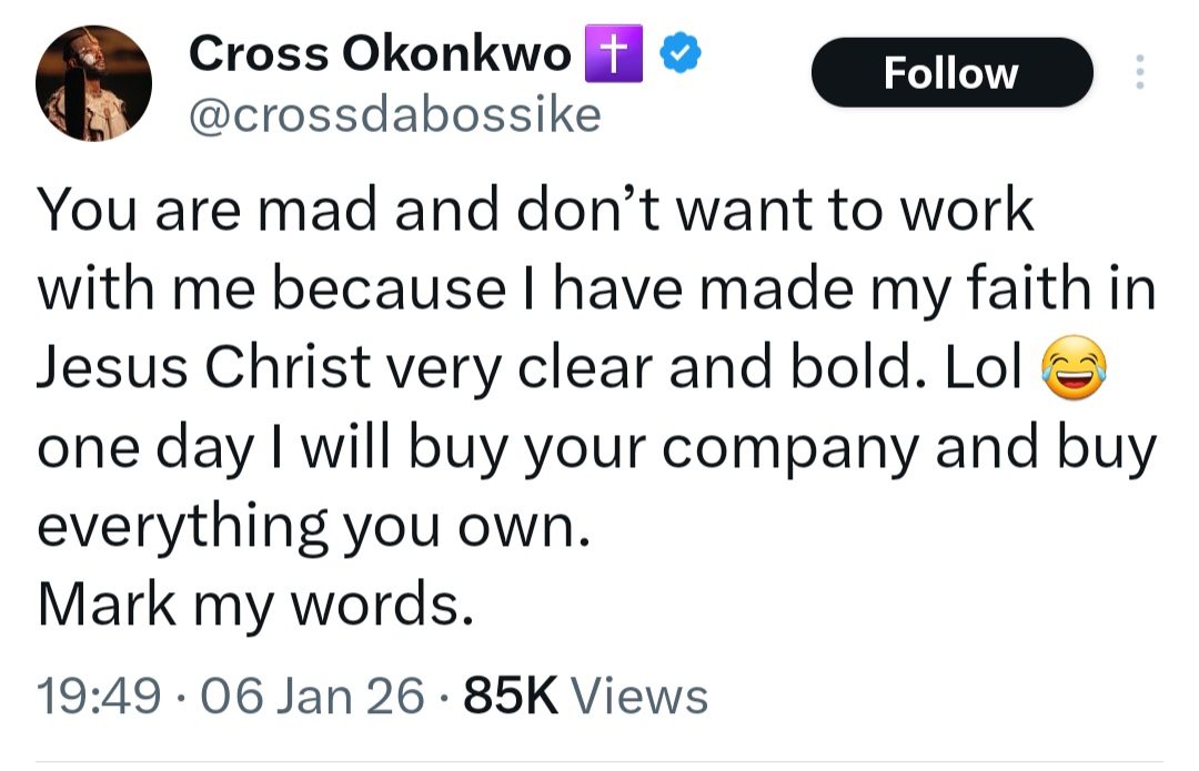 Cross Okonkwo, popularly known as Cross da Boss, has addressed an issue he is facing for being vocal about his religious beliefs. The former Big Brother Naija reality star addressed a certain person who doesn’t want to work with him because he’s been vocal about his faith in Jesus Christ. Cross wrote: “You are mad and dont want to work with me because I have made my faith in Jesus Christ very clear and bold. Lol. “One day I will buy your company and buy everything you own. Mark my words.”